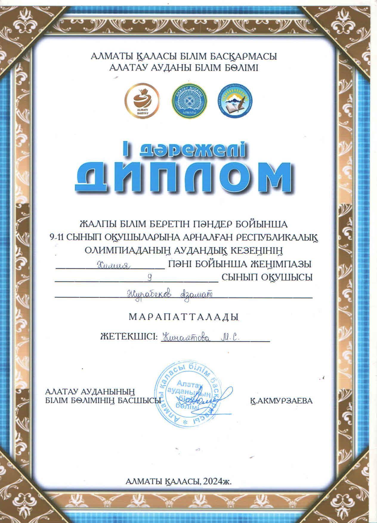 №164 Жалпы білім беретін мектеп » Ақпарат » 9-11 сынып оқушыларына арналған Республикалық олимпиаданың аудандық кезеңіне ХИМИЯ пәні бойынша 9 "Ә" сынып оқушысы А.Журабеков қатысып, жүлделі І орынға ие болды. Жетекшісі химия пәні мұғалімі М.Кинаятова.