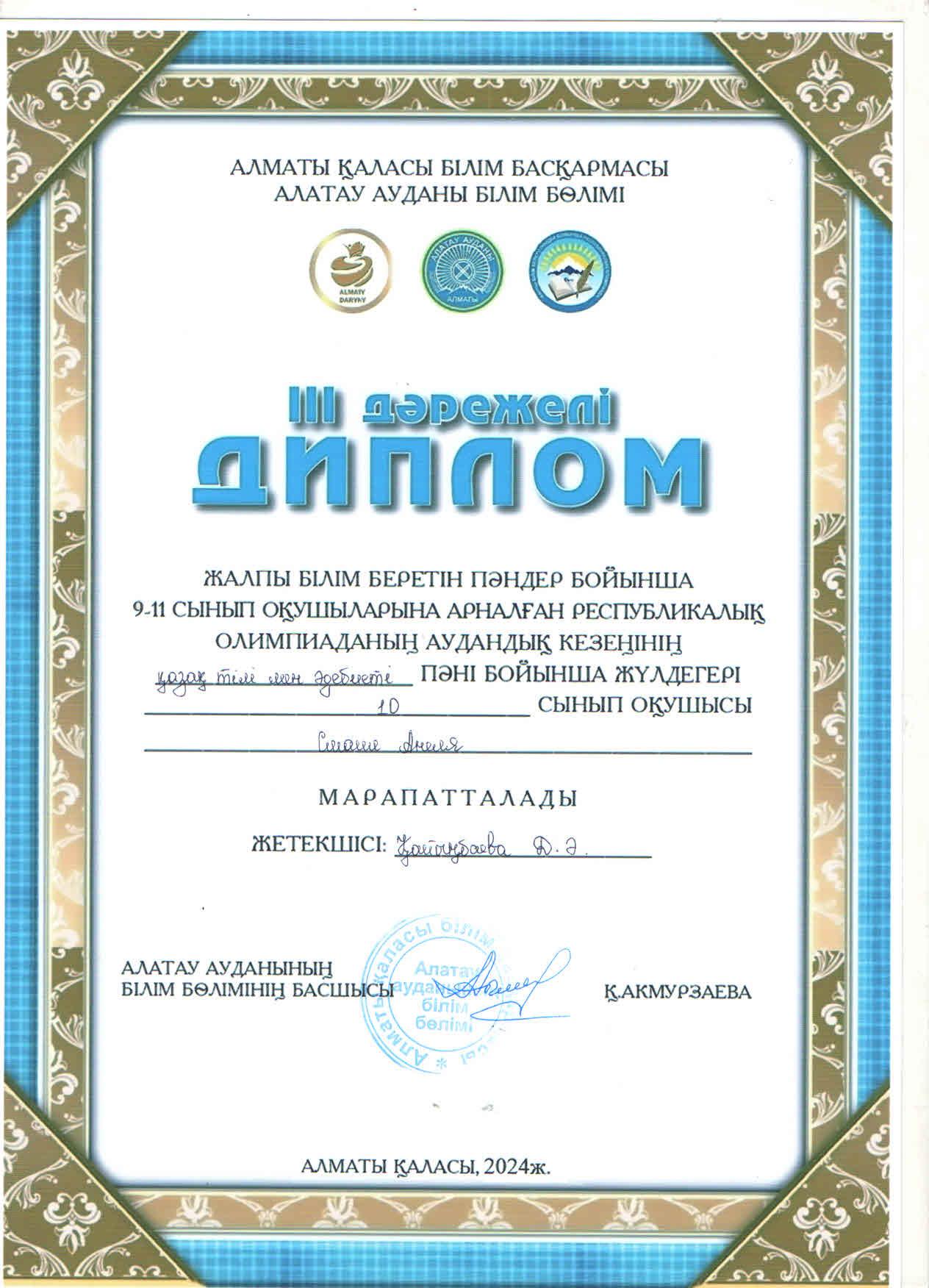 №164 Жалпы білім беретін мектеп » Ақпарат » 9-11 сынып оқушыларына арналған Республикалық олимпиаданың аудандық кезеңіне ҚАЗАҚ ТІЛІ пәні бойынша 10 "Ә" сынып оқушысыА.Смаил қатысып, жүлделі ІІІ орынға ие болды. Жетекшісі қазақ тілі мен әдебиеті пәні мұғалімі Д.Қайыңбаева.