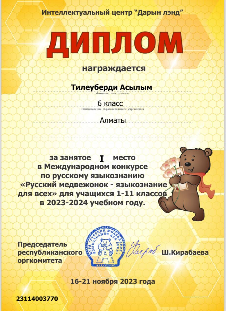 №164 Жалпы білім беретін мектеп » Ақпарат » Халықаралық "Русский медвеженок- языкознание для всех" атты орыс тілі пәні байқауына 6 сынып оқушылары А.Тілеуберді, Ә.Қуантай, А.Зайир қатысып, І орынға ие болды. Жетекшісі орыс тілі мен әдебиеті пәні мұғалімі Г.Халметова