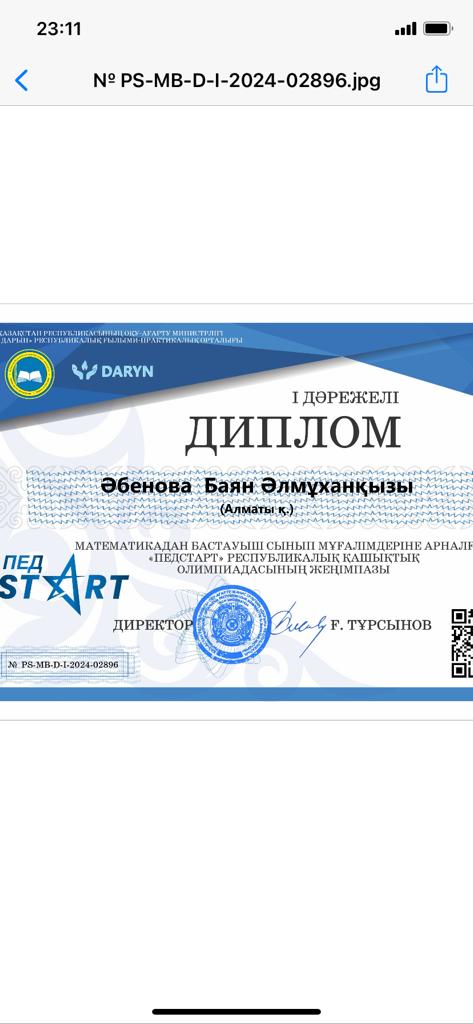 №164 Жалпы білім беретін мектеп » Ақпарат » Математикадан бастауыш сынып мұғалімдеріне арналған "Педстарт" РЕСПУБЛИКАЛЫҚ қашықтық олимпиадасының І дәрежелі диплом иегері бастауыш сынып мұғалімі Б.Әбенова