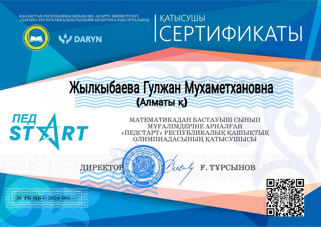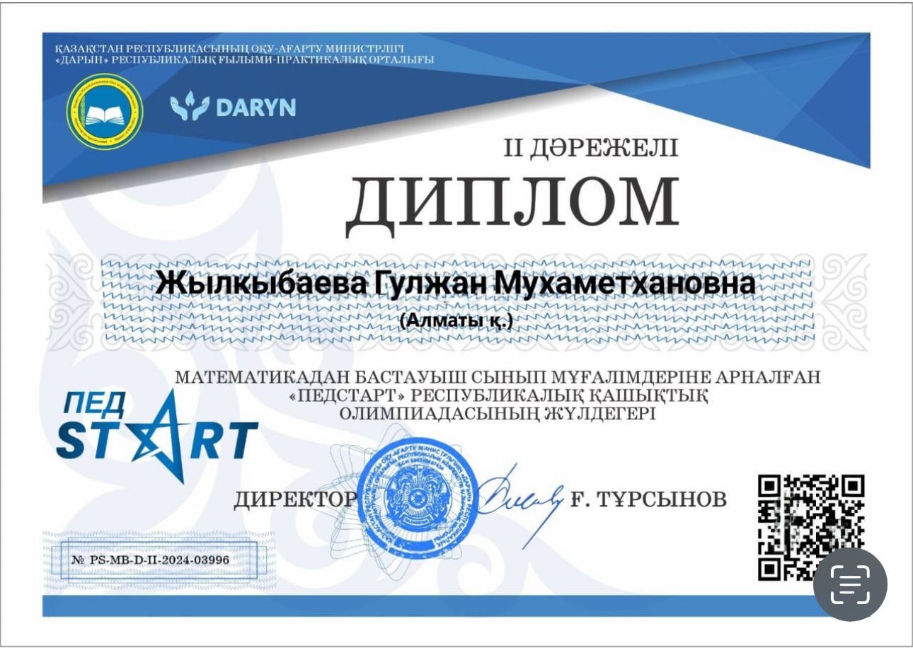 №164 Жалпы білім беретін мектеп » Ақпарат » Математикадан бастауыш сынып мұғалімдеріне арналған "Педстарт" РЕСПУБЛИКАЛЫҚ қашықтық олимпиадасының ІІ дәрежелі диплом иегері бастауыш сынып мұғалімі Г.Жылкыбаева