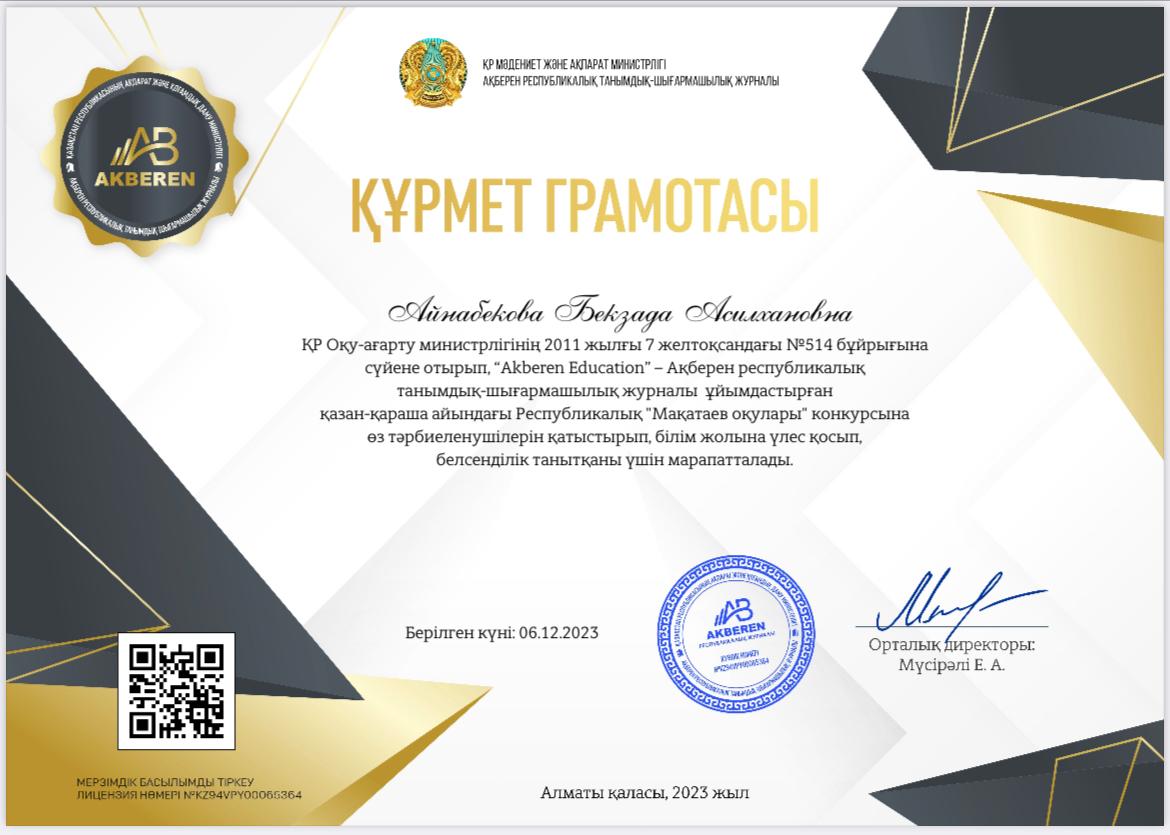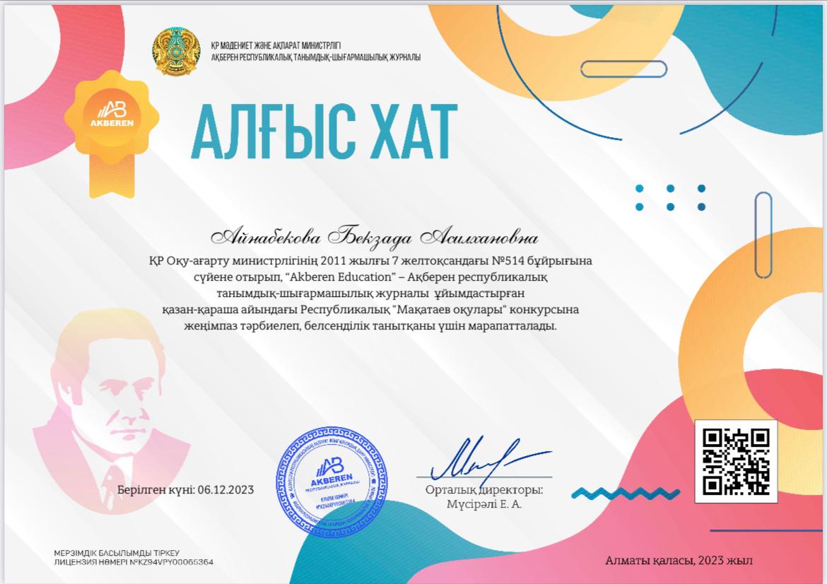 Ақберен республикалық танымдық-шығармашылық журналы ұйымдастырған Республикалық "Мақатаев оқулары" конкурсына оқушыларын қатыстырып, белсенділік танытқаны үшін бастауыш сынып мұғалімі Б.Айнабекова Құрмет грамотасы және Алғыс хатпен марапатталды.