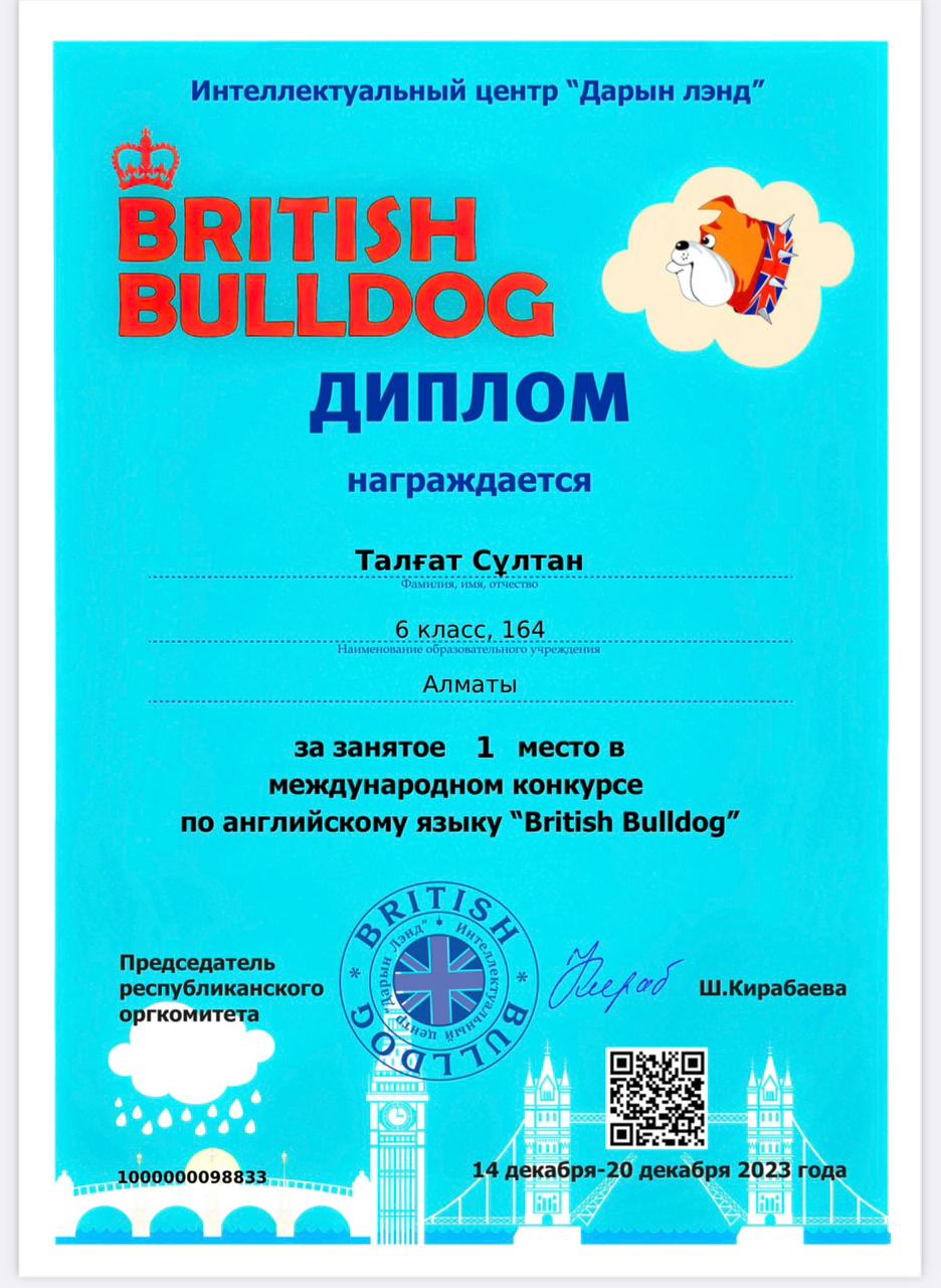№164 Жалпы білім беретін мектеп » Ақпарат » Халықаралық BRITISH BULLDOG ағылшын тілі олимпиадасына 6 "В" сынып оқушысы С.Талғат қатысып, жүлделі І орынға ие болды. Жетекшісі ағылшын тілі пәні мұғалімі А.Аққұлы