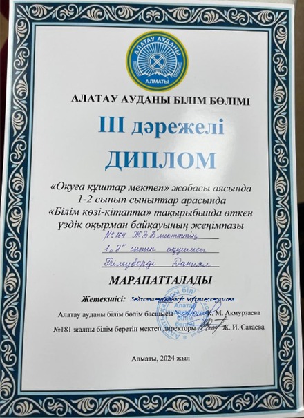 Аудандық "Оқуға құштар мектеп" жобасы аясында 1-2 сыныптар арасындағы "Білім көзі - кітапта" тақырыбындағы өткен оқырман байқауына 1 "Ә" сынып оқушысы Тілеуберді Даниял қатысып, жүлделі ІІІ орынға ие болды.