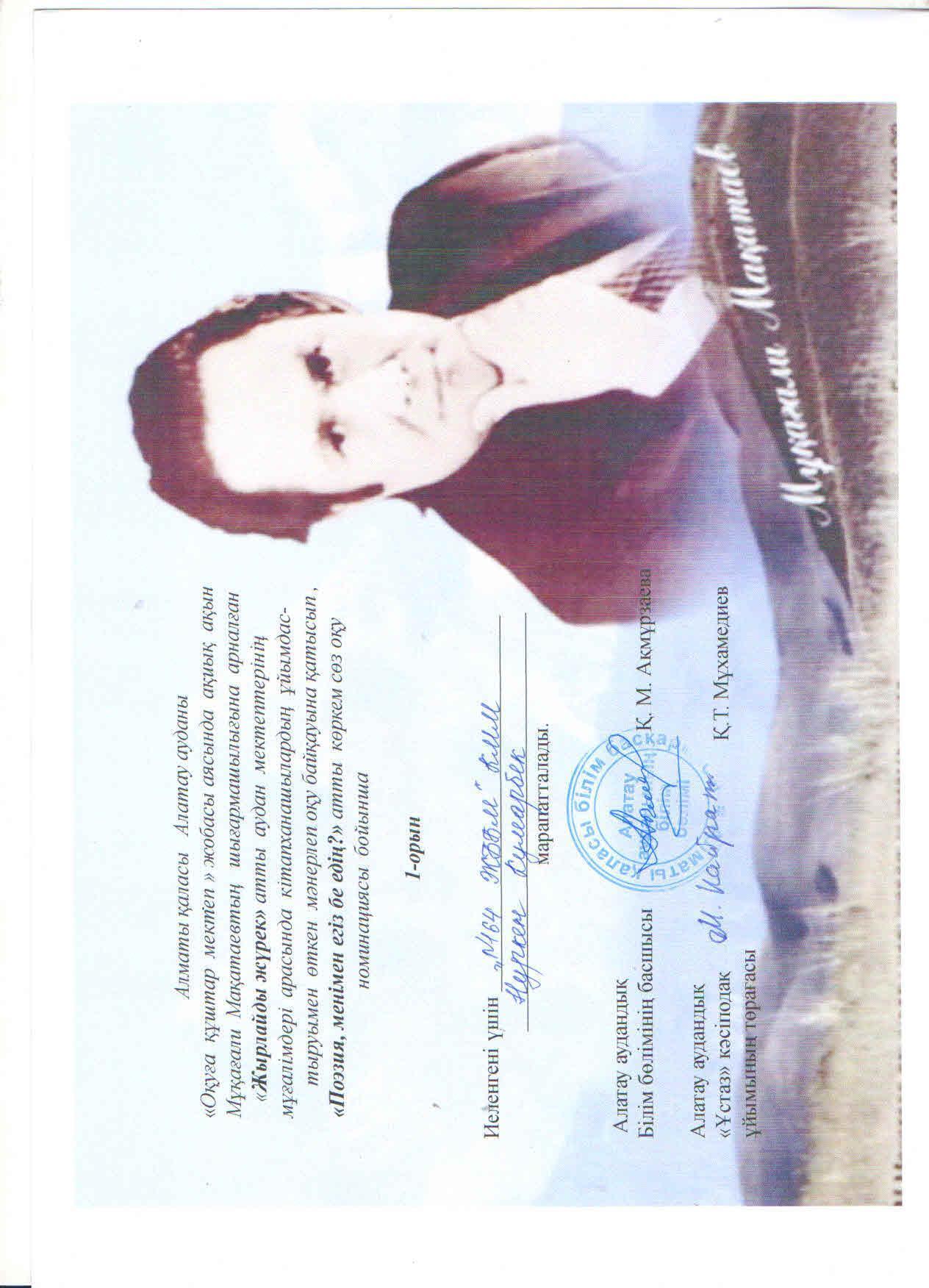 "Жырлайды жүрек" атты мұғалімдер арасындағы мәнерлеп оқу байқауына "Поэзия, менімен егіз бе едің?" атты көркем сөз оқу номинациясы бойынша мектебіміздің қазақ тілі мен әдебиеті пәні мұғалімі Н.Құмарбек қатысып, І орынға ие болды.