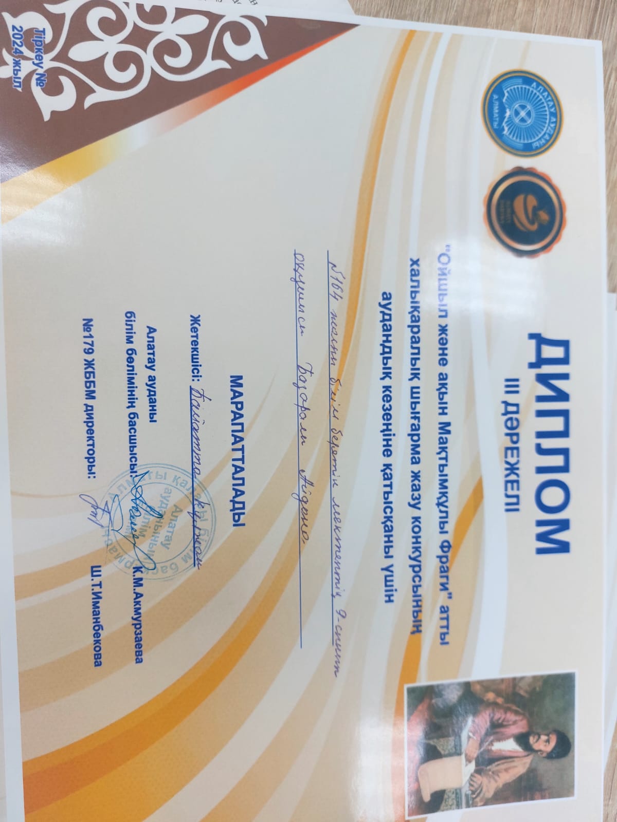 №164 Жалпы білім беретін мектеп » Ақпарат » "Ойшыл және ақын Мақтымұлы Фраги" атты халықаралық шығарма жазу конкурсының аудандық кезеңіне 9 "Г" сынып оқушысы А.Базаралы қатысып, жүлделі ІІІ орынға ие болды. Жетекшісі қазақ тілі мен әдебиеті пәні мұғалімі К.Байатта
