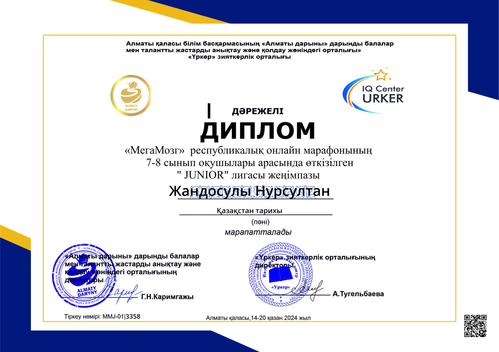 "МегаМозг" республикалық онлайн марафонына қазақстан тарихы пәнінен қатысып, "JUNIOR" лигасының І орын иегерлері 7-8 сынып оқушылары Н.Ризақ, Н.Жандосұлы, И.Фавролов, Ә.Габдуллин, А.Жанат, А.Усенова, Ж.Ахметова, Д.Әзімбай.