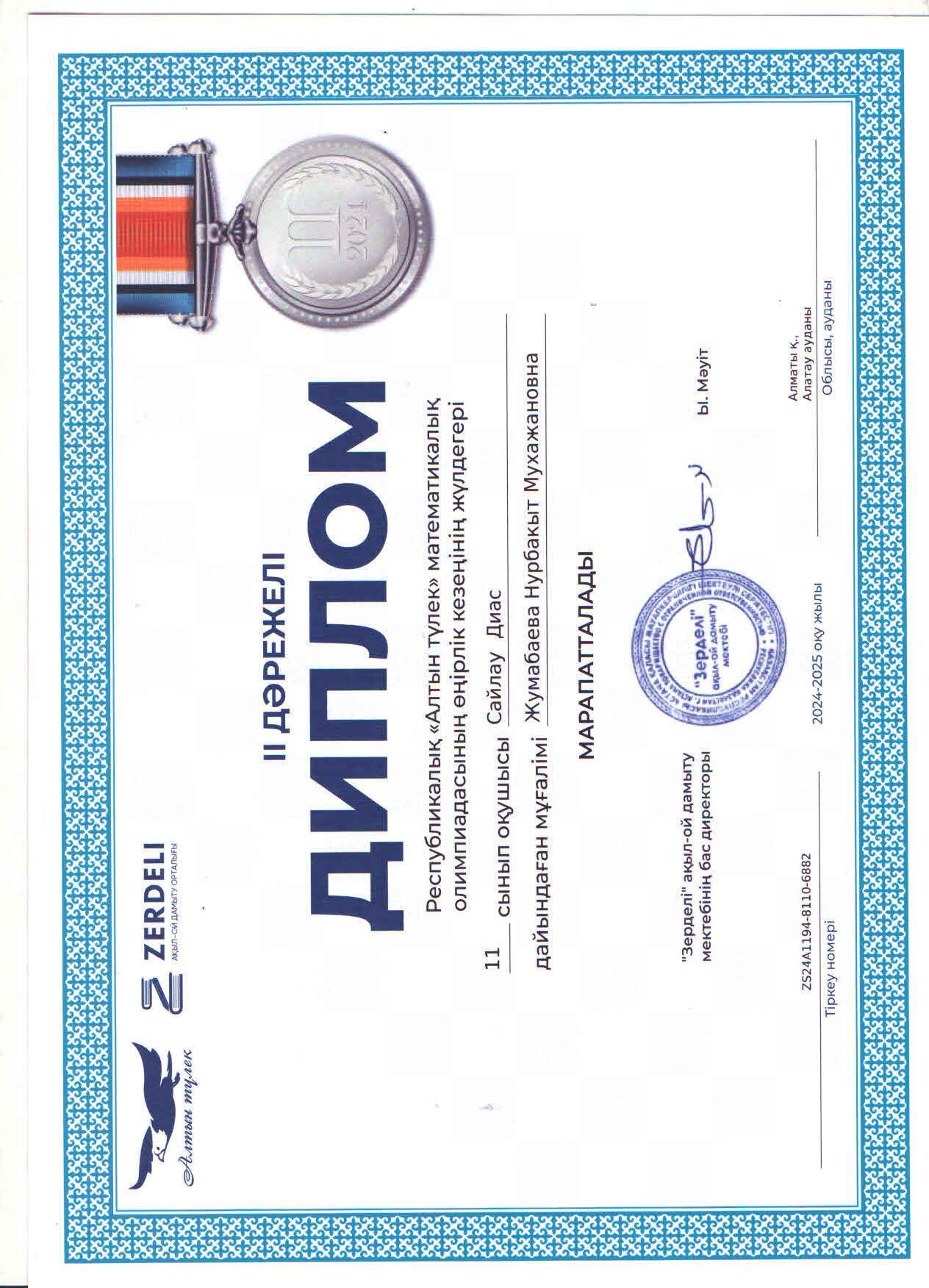 Республикалық "Алтын түлек" математикалық олимпиадасының аудандық кезеңіне 11 "Ә" сынып оқушысы Сайлау Диас қатысып, жүлделі ІІ орынға ие болды. Жетекшісі, математика пәні мұғалімі Н.Жумабаева.