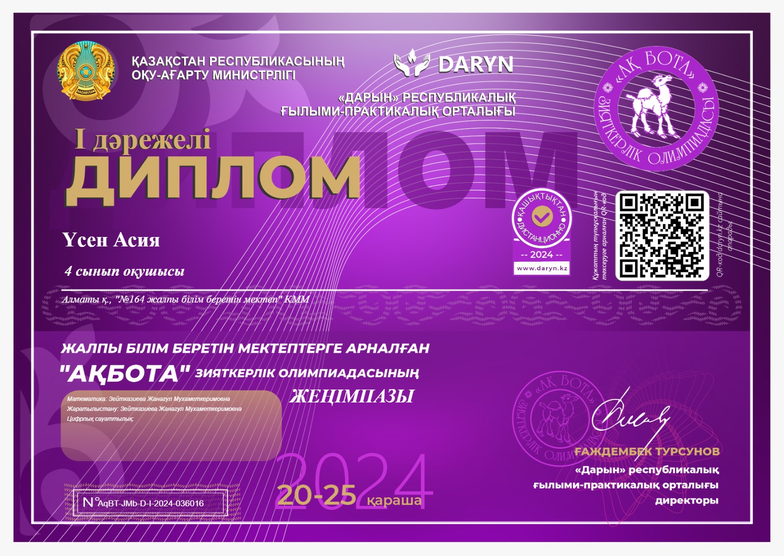 №164 Жалпы білім беретін мектеп » Ақпарат » "Дарын" республикалық ғылыми-практикалық орталығы өткізген "АҚ БОТА" зияткерлік олимпиадасының І орын жүлдегерлері 4 "Г" сынып оқушылары Ж.Құлмұрат, А.Үсен. Жетекшісі бастауыш сынып мұғалімі Ж.Зейтказиева.