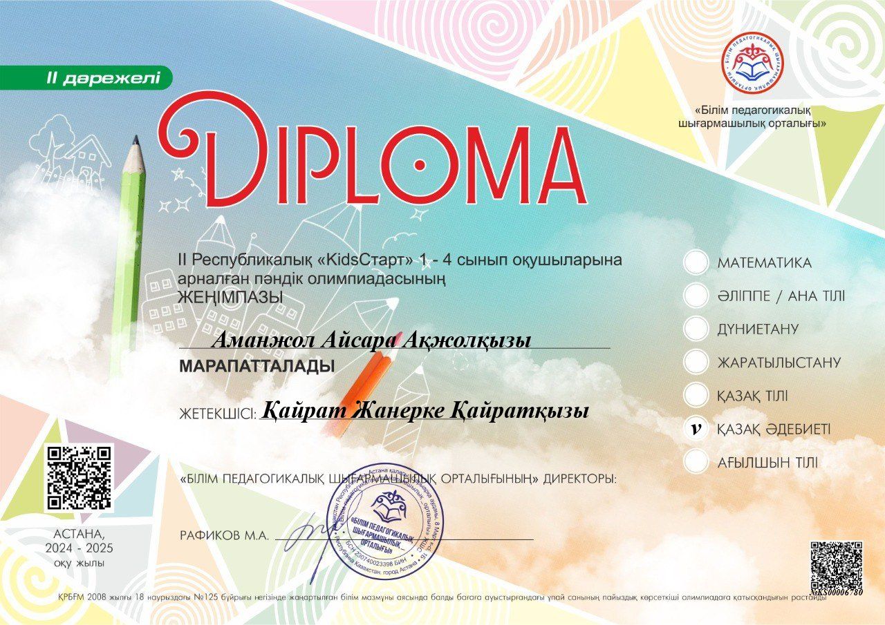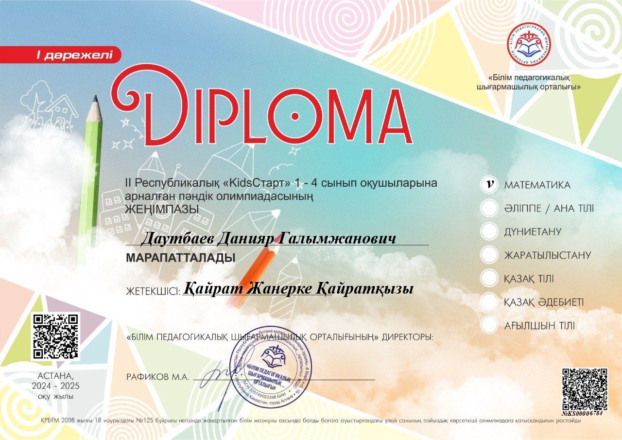1-4 сынып оқушыларына арналған ІІ Республикалық "KidsСтарт" пәндік олимпиадасына 2 "Б" сынып оқушылары математика пәнінен С.Шералы, А.Аманжол, А.Абажанова, Н.Ерғали, Д.Даутбаев, М.Медина, І.Миллион І орын, А.Аманжол, А.Дамирұлы ІІорын