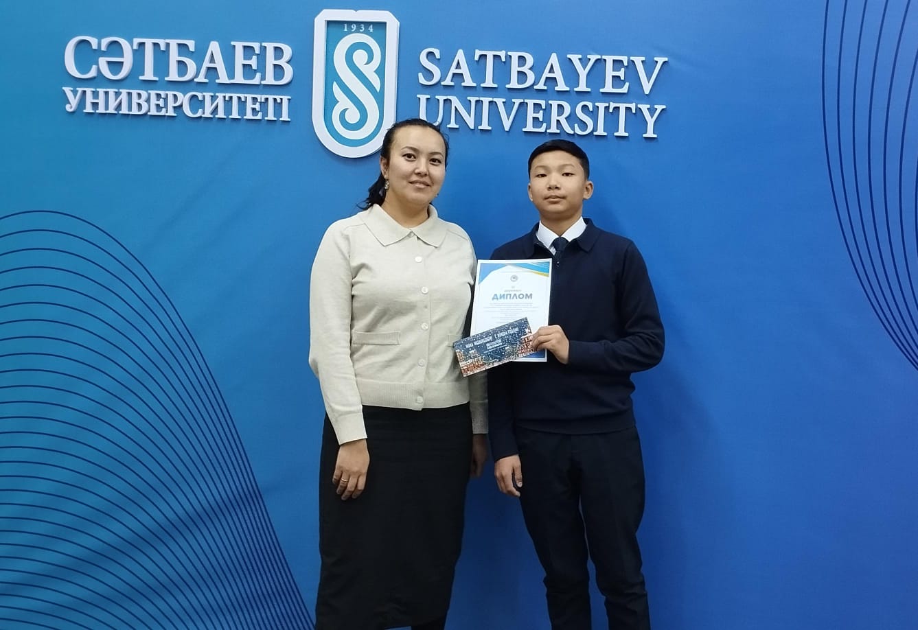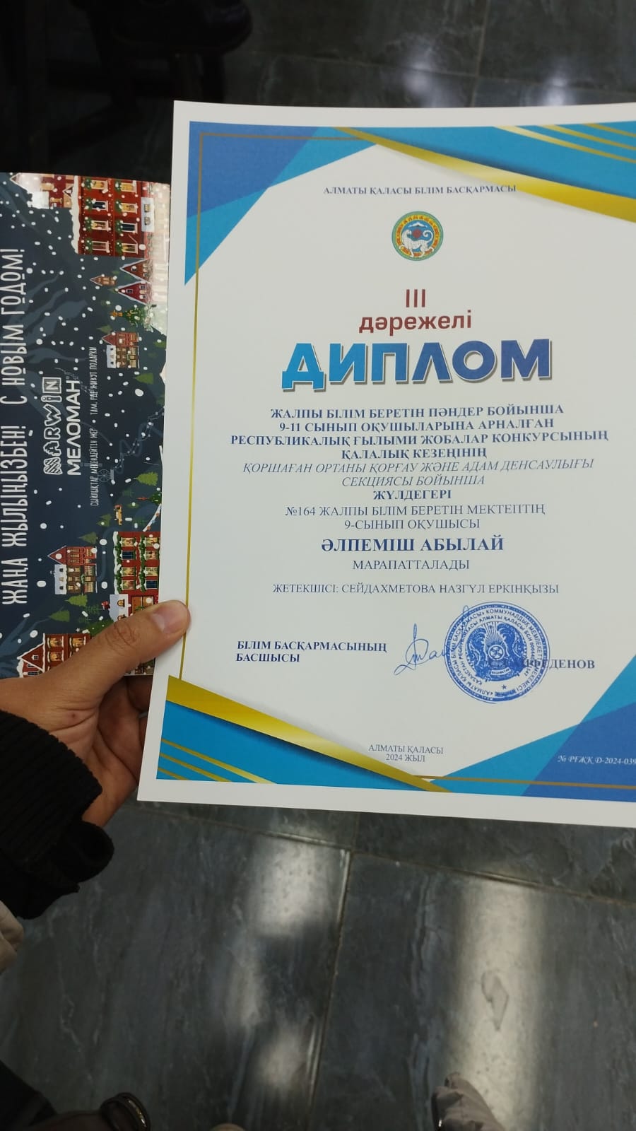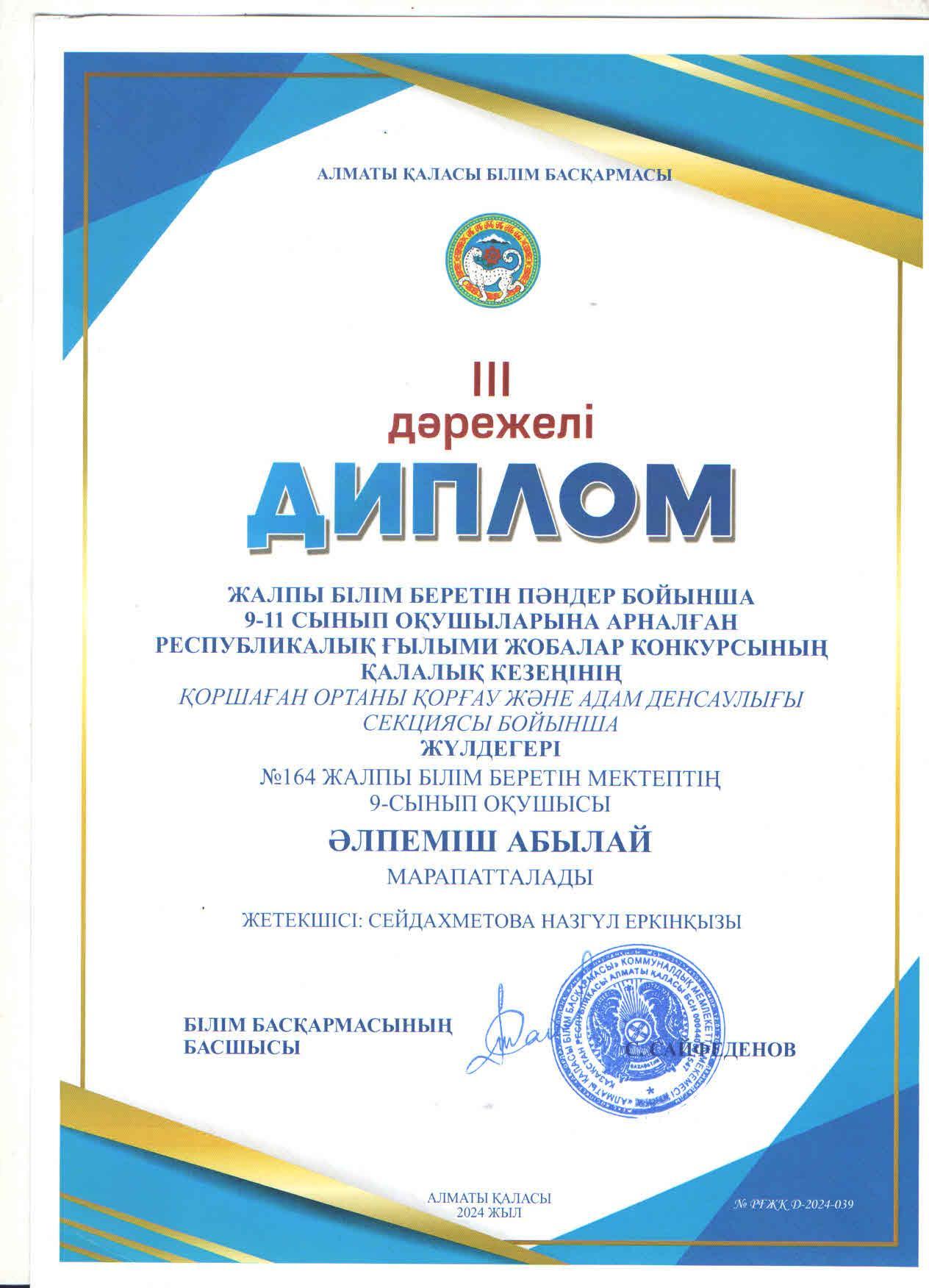 "Дарын" жалпы білім беретін пәндер бойынша оқушылардың республикалық зерттеу жобаларының қалалық кезеңінің "Қоршаған ортаны қорғау және адам денсаулығы" секциясы бойынша ІІІ орын иегері 9 "Г" сынып оқушысы Әлпеміш Абылай.