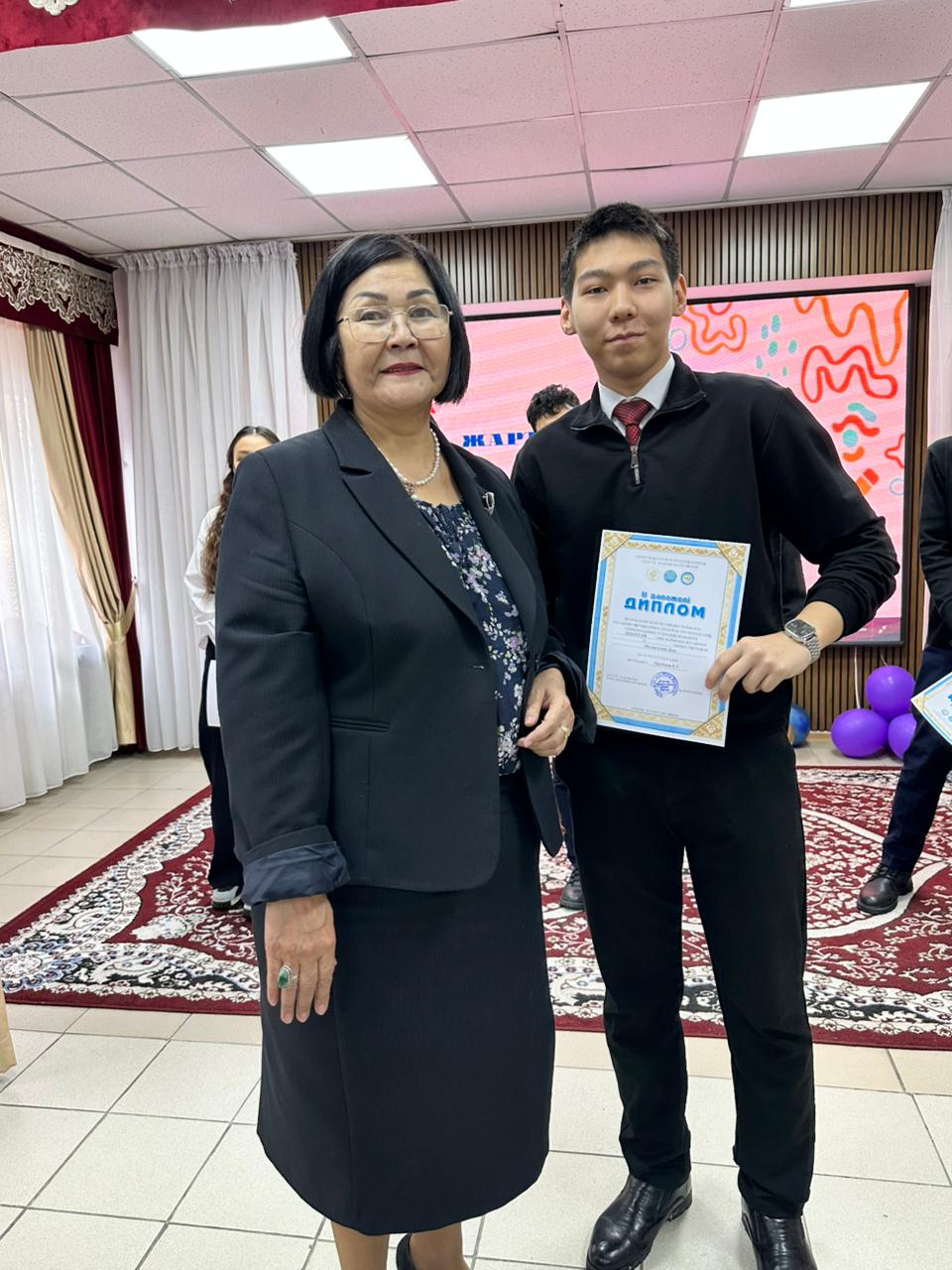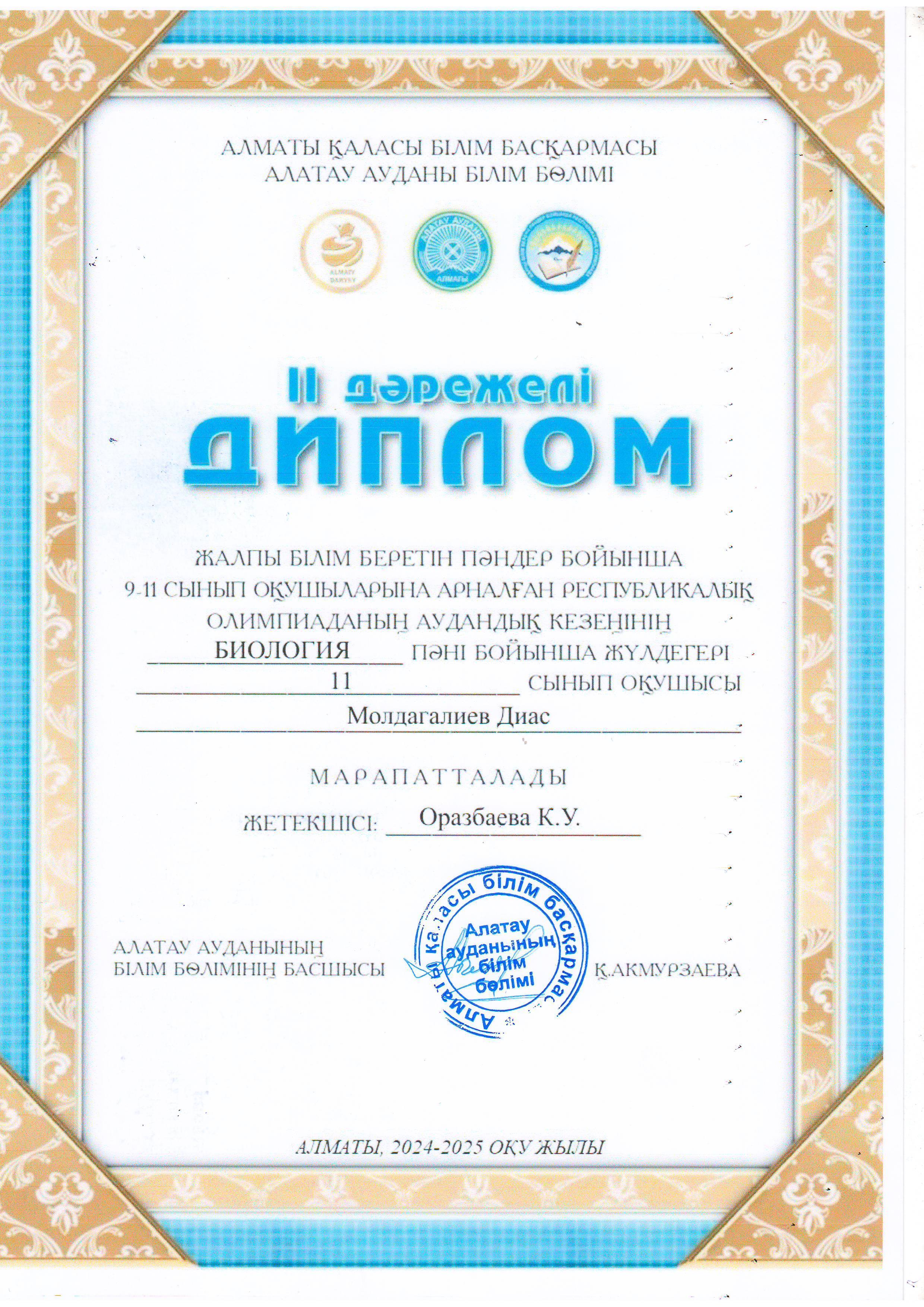9-11 сынып оқушыларына арналған Республикалық олимпиаданың аудандық кезеңіне БИОЛОГИЯ пәні бойынша қатысып, жүлделі ІІ орынға ие болған 11 "Б" сынып оқушысы Молдағалиев Диас. Жетекшісі биология пәні мұғалімі К.Оразбаева.
