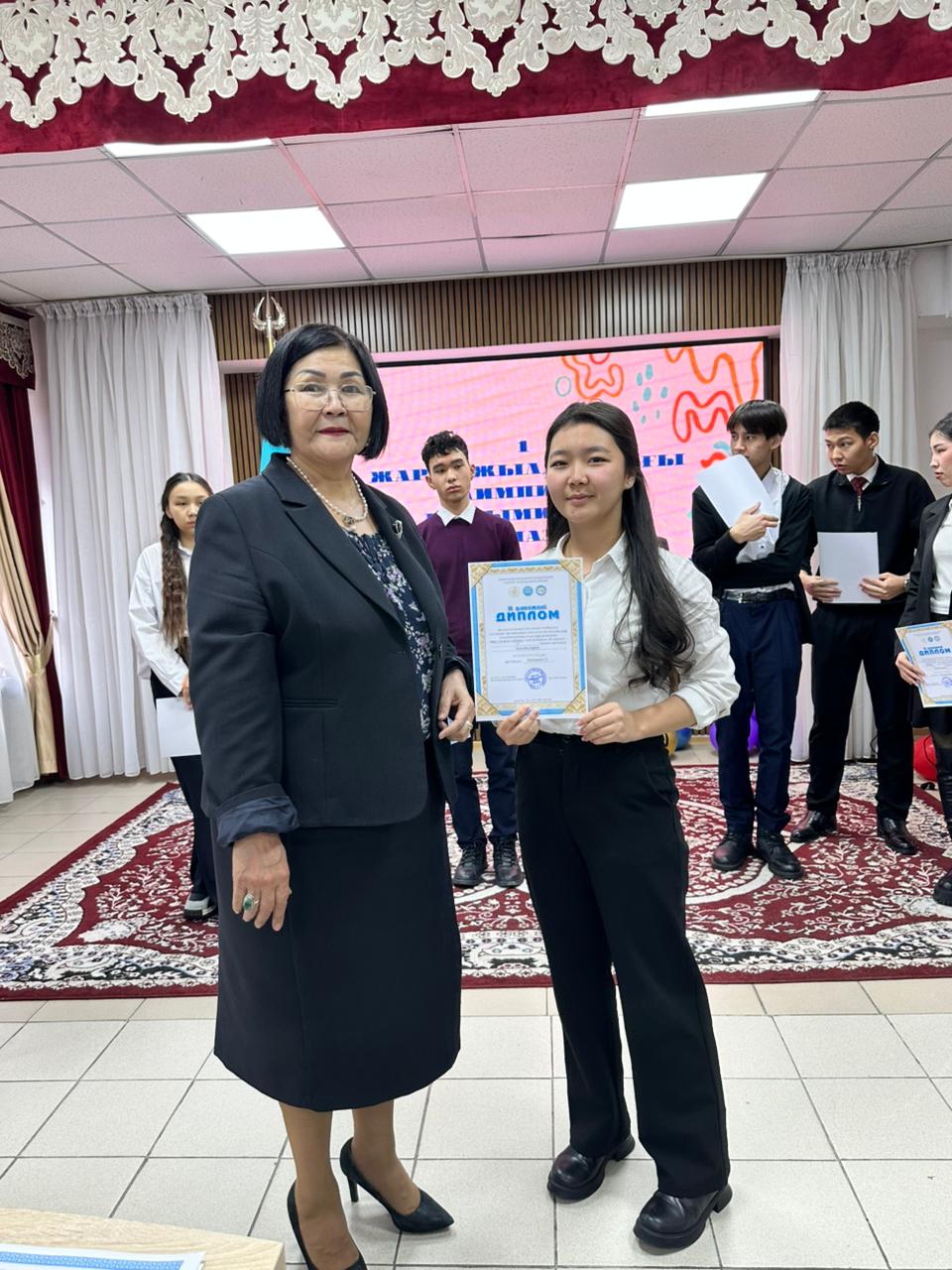9-11 сынып оқушыларына арналған Республикалық олимпиаданың аудандық кезеңіне ОРЫС ТІЛІ МЕН ӘДЕБИЕТІ пәні бойынша қатысып, жүлделі ІІ орынға ие болған 11 "А" сынып оқушысы Пазылбек Нұрсая. Жетекшісі орыс тілі пәні мұғалімі С.Телагисова