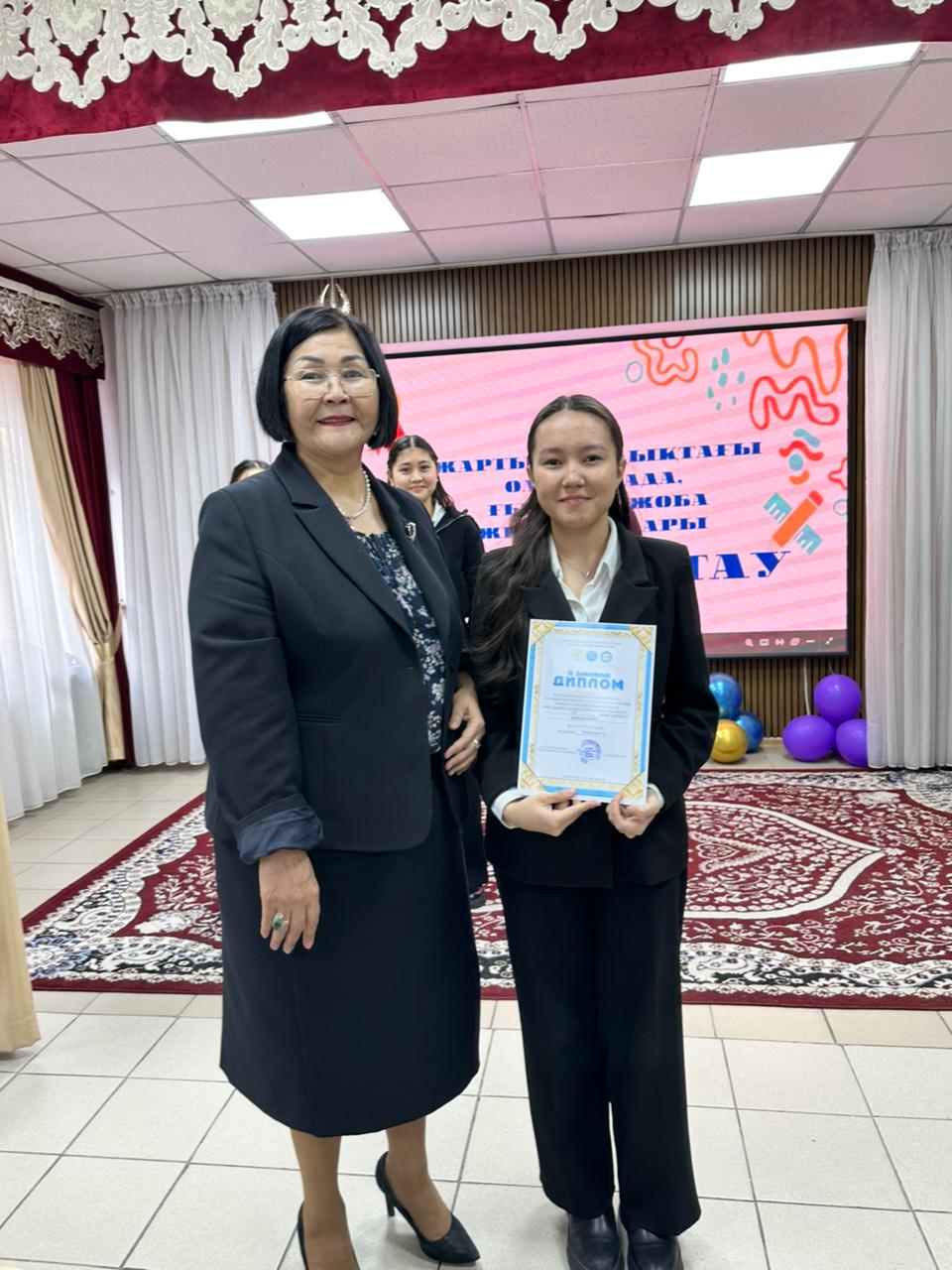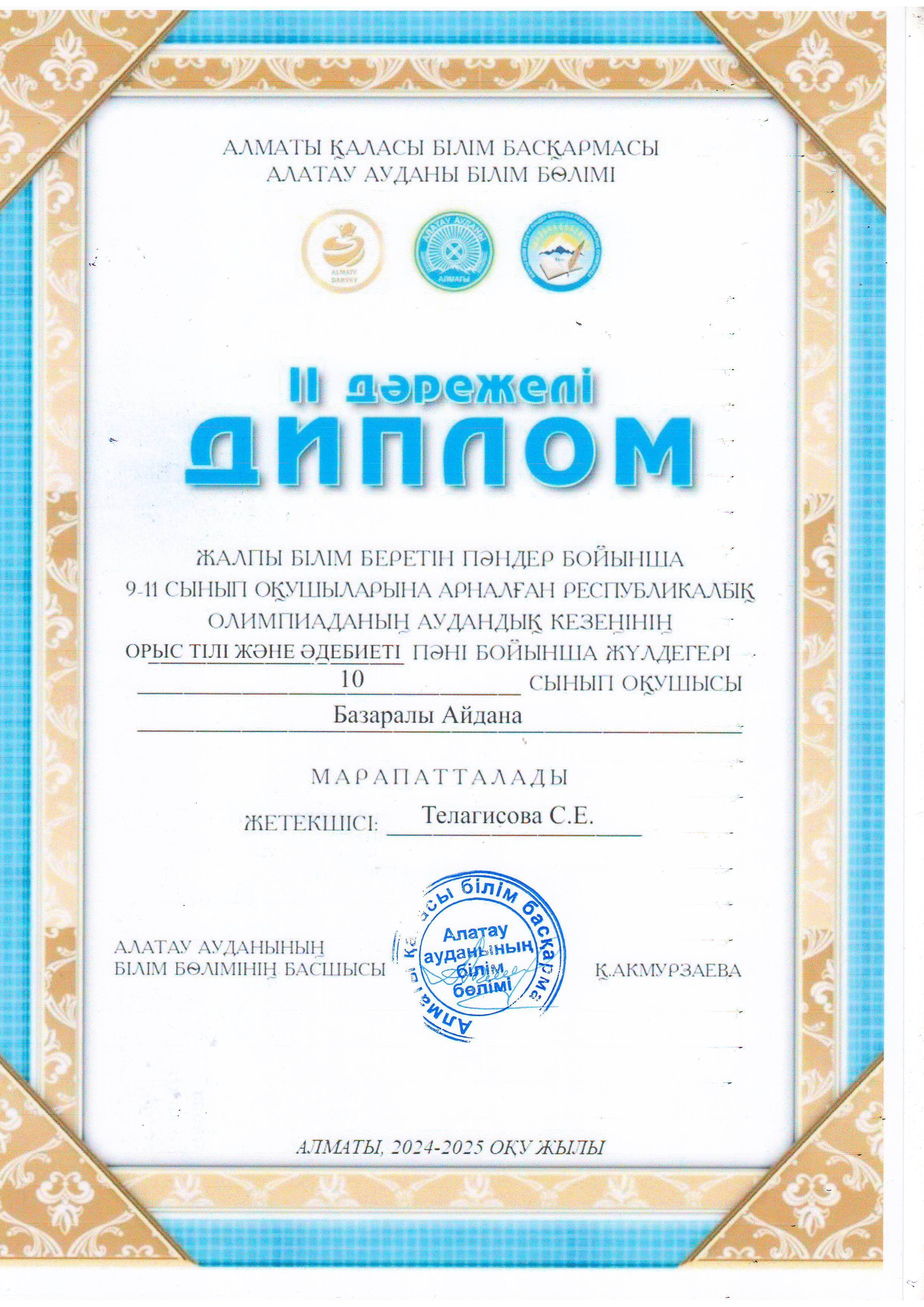 9-11 сынып оқушыларына арналған Республикалық олимпиаданың аудандық кезеңіне ОРЫС ТІЛІ МЕН ӘДЕБИЕТІ пәні бойынша қатысып, жүлделі ІІ орынға ие болған 10 "Ә" сынып оқушысы Базаралы Айдана. Жетекшісі орыс тілі пәні мұғалімі С.Телагисова