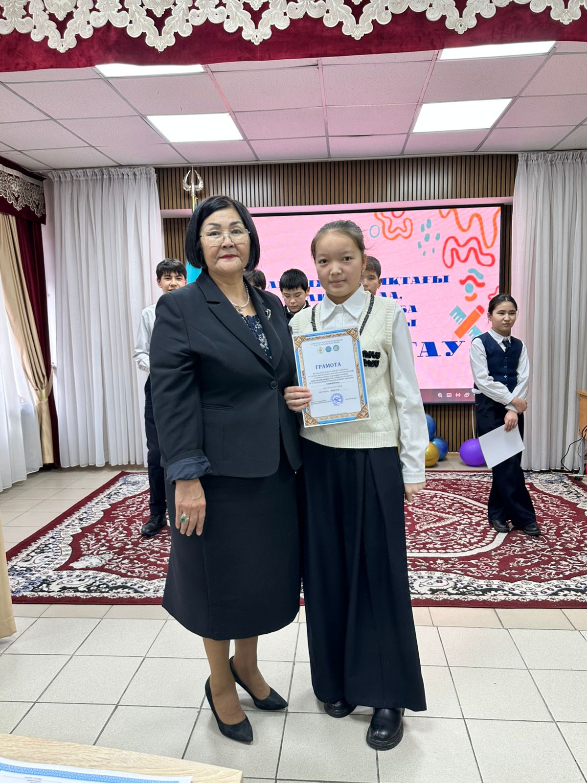 Жалпы білім беретін пәндер бойынша 7-8 сынып оқушыларына арналған республикалық жасөспірімдер олимпиадасының аудандық кезеңіне ҚАЗАҚ ТІЛІ пәні бойынша қатысып, жүлделі грамотаға ие болған 8 "В" сынып оқушысы Усербай Ботагоз.