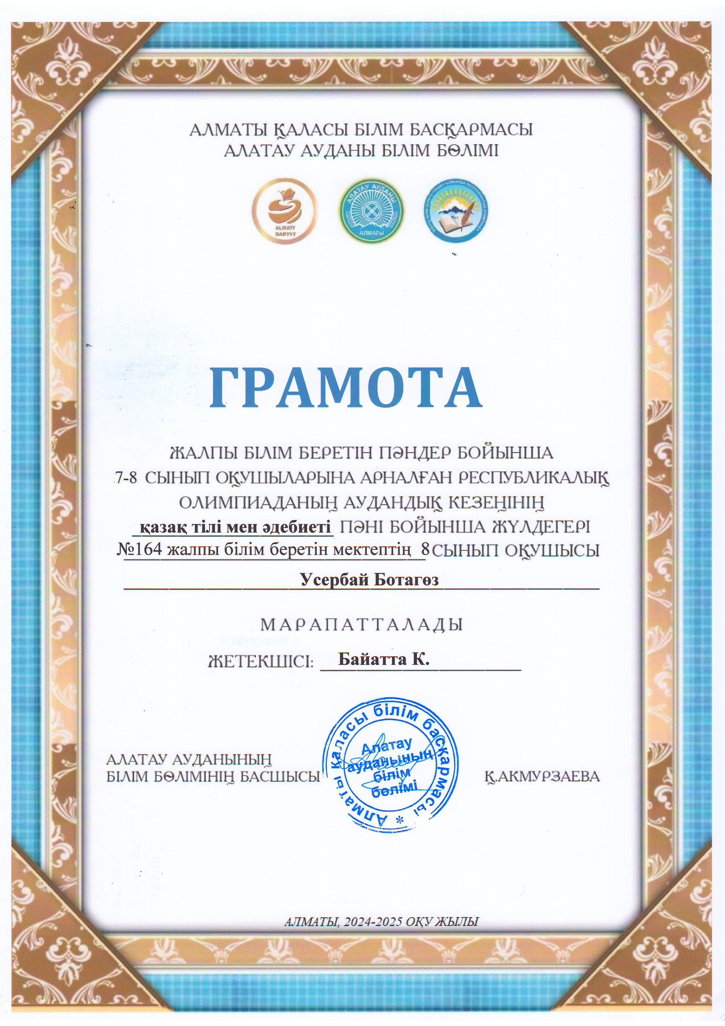 №164 Жалпы білім беретін мектеп » Ақпарат » Жалпы білім беретін пәндер бойынша 7-8 сынып оқушыларына арналған республикалық жасөспірімдер олимпиадасының аудандық кезеңіне ҚАЗАҚ ТІЛІ пәні бойынша қатысып, жүлделі грамотаға ие болған 8 "В" сынып оқушысы Усербай Ботагоз.