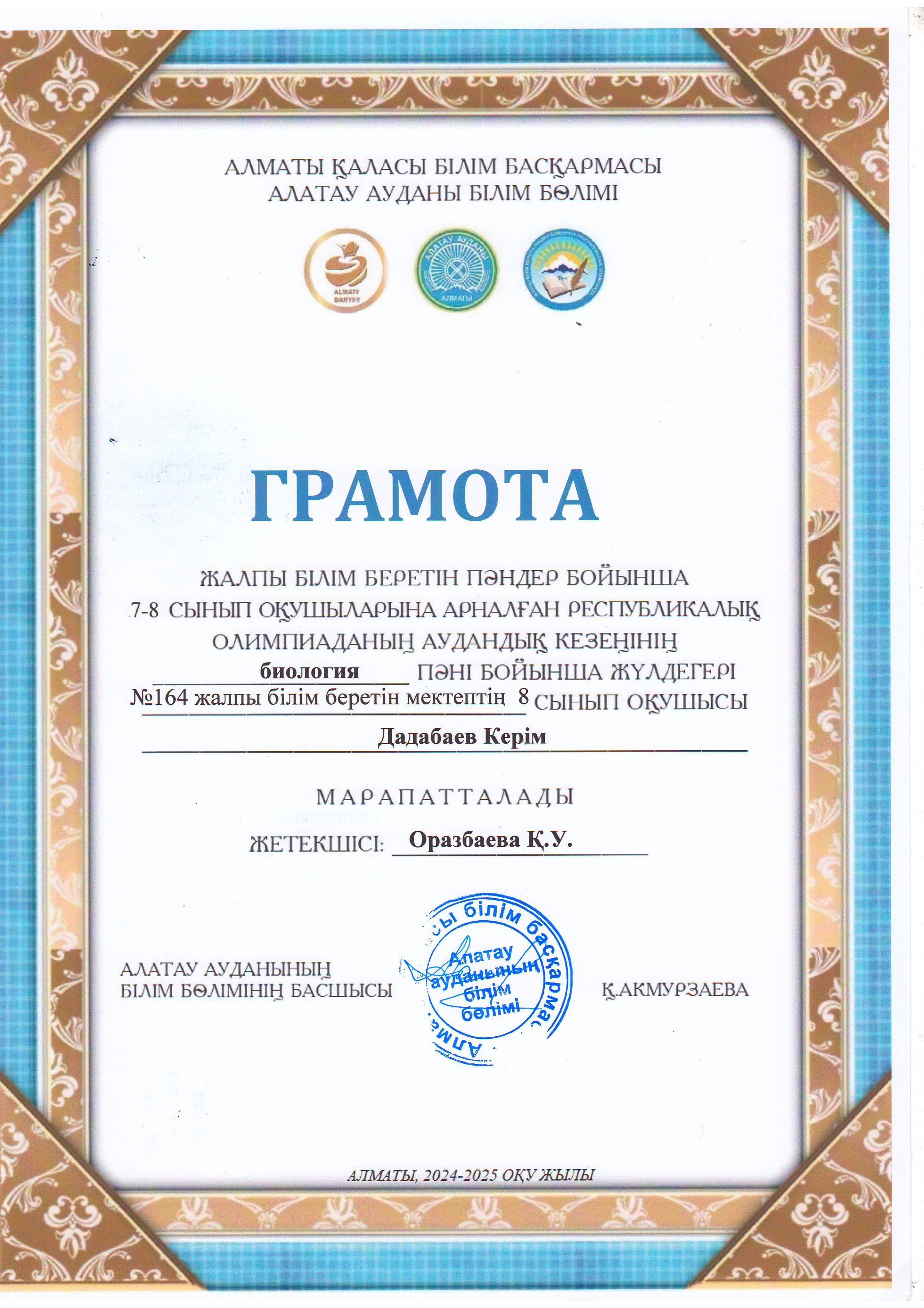 №164 Жалпы білім беретін мектеп » Ақпарат » Жалпы білім беретін пәндер бойынша 7-8 сынып оқушыларына арналған республикалық жасөспірімдер олимпиадасының аудандық кезеңіне БИОЛОГИЯ пәні бойынша қатысып, жүлделі грамотаға ие болған 8 "Б" сынып оқушысы Дадабаев Керім.