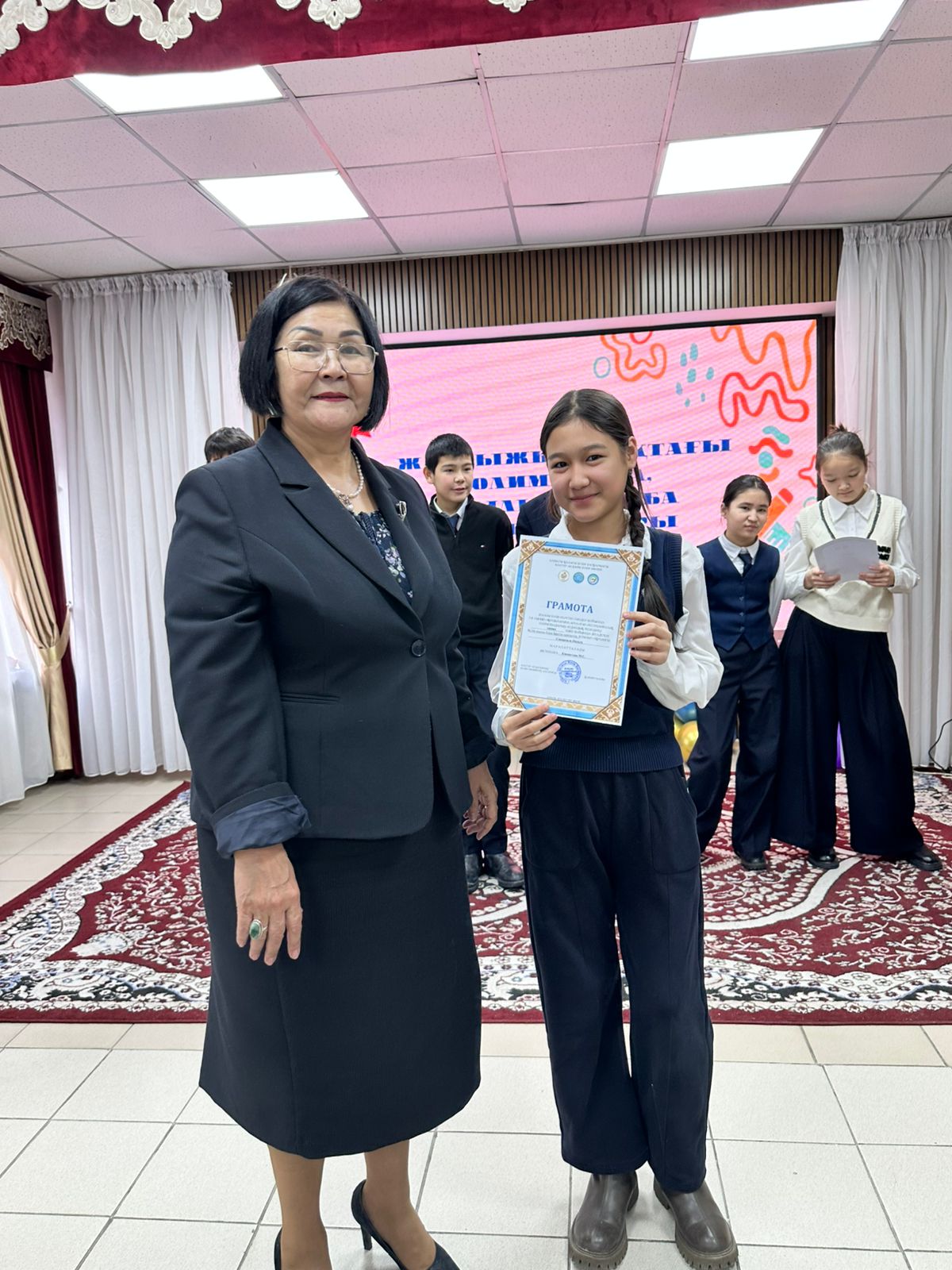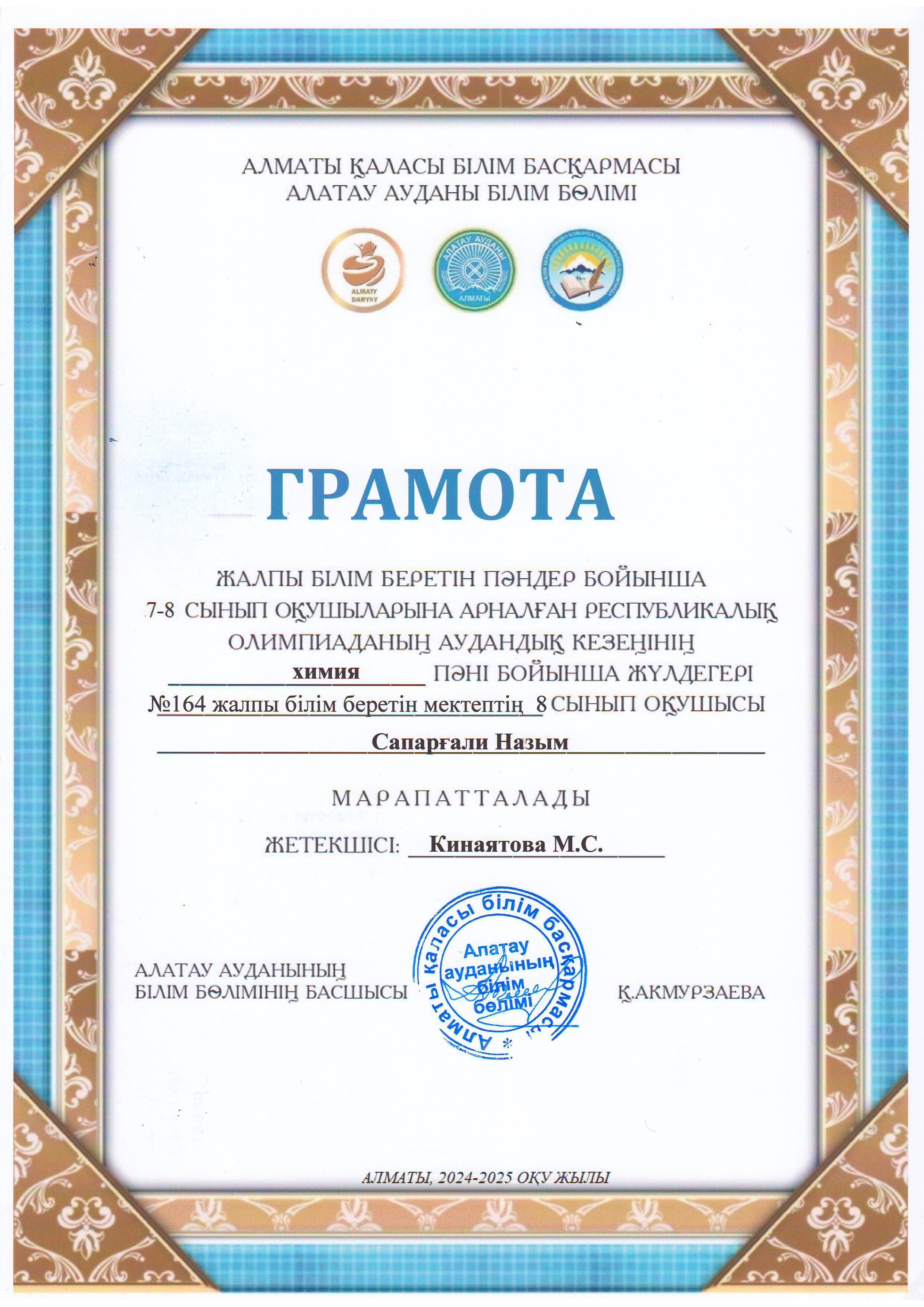 Жалпы білім беретін пәндер бойынша 7-8 сынып оқушыларына арналған республикалық жасөспірімдер олимпиадасының аудандық кезеңіне ХИМИЯ пәні бойынша қатысып, грамотаға ие болған 8 "В" сынып оқушысы Сапарғали Назым.