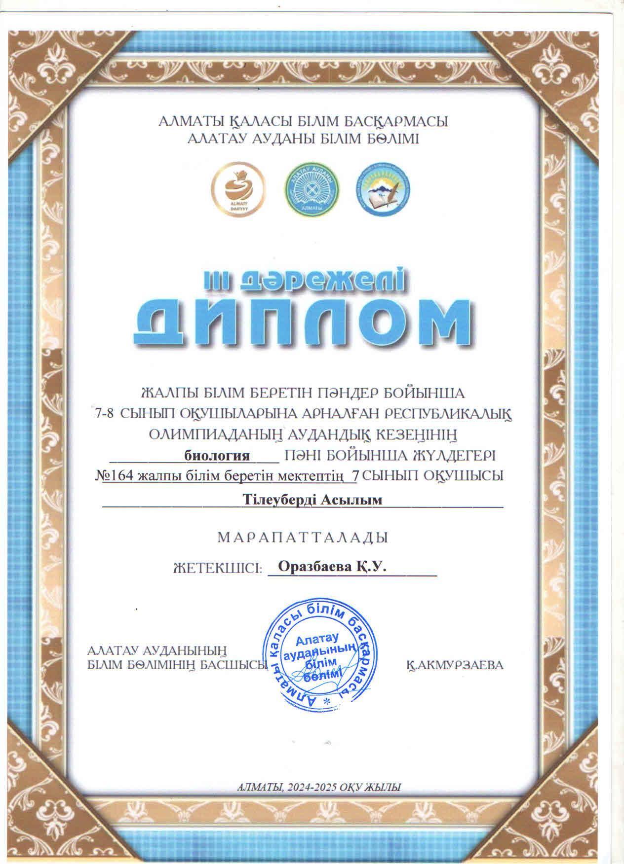 Жалпы білім беретін пәндер бойынша 7-8 сынып оқушыларына арналған республикалық жасөспірімдер олимпиадасының аудандық кезеңіне БИОЛОГИЯ пәні бойынша қатысып, жүлделі ІІІ орынға ие болған 7 "А" сынып оқушысы Тілеуберді Асылым.