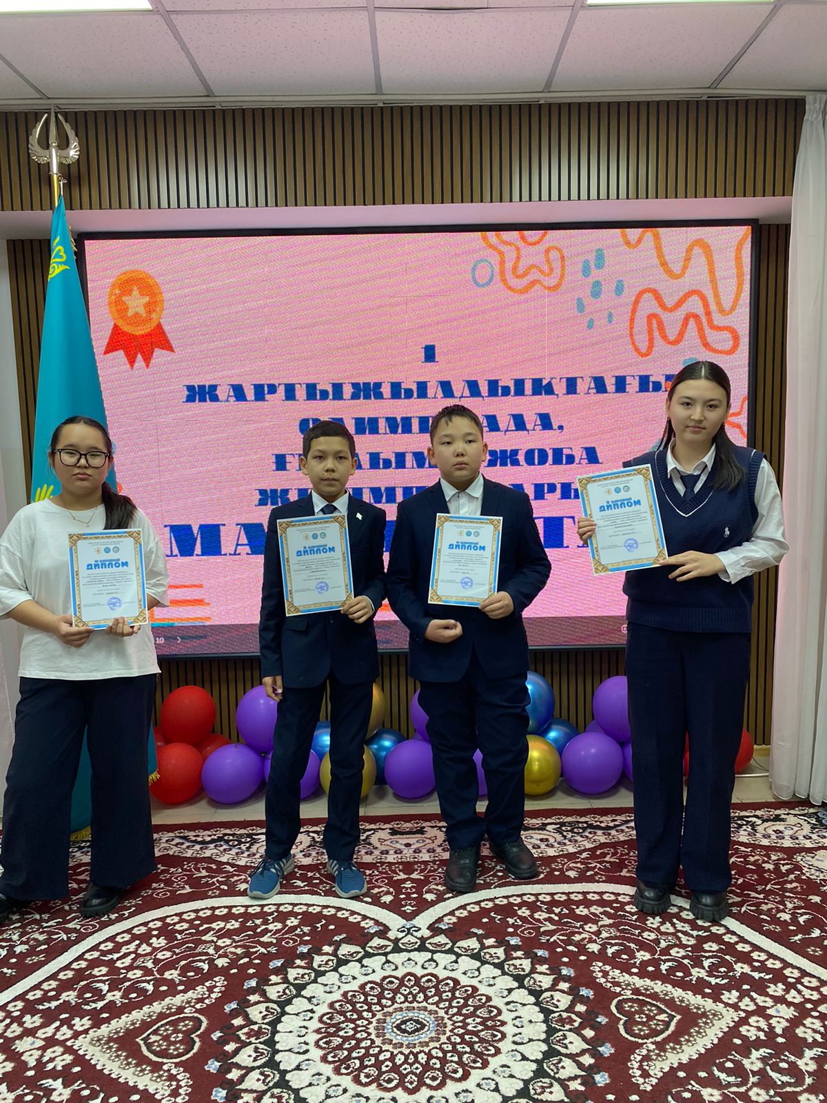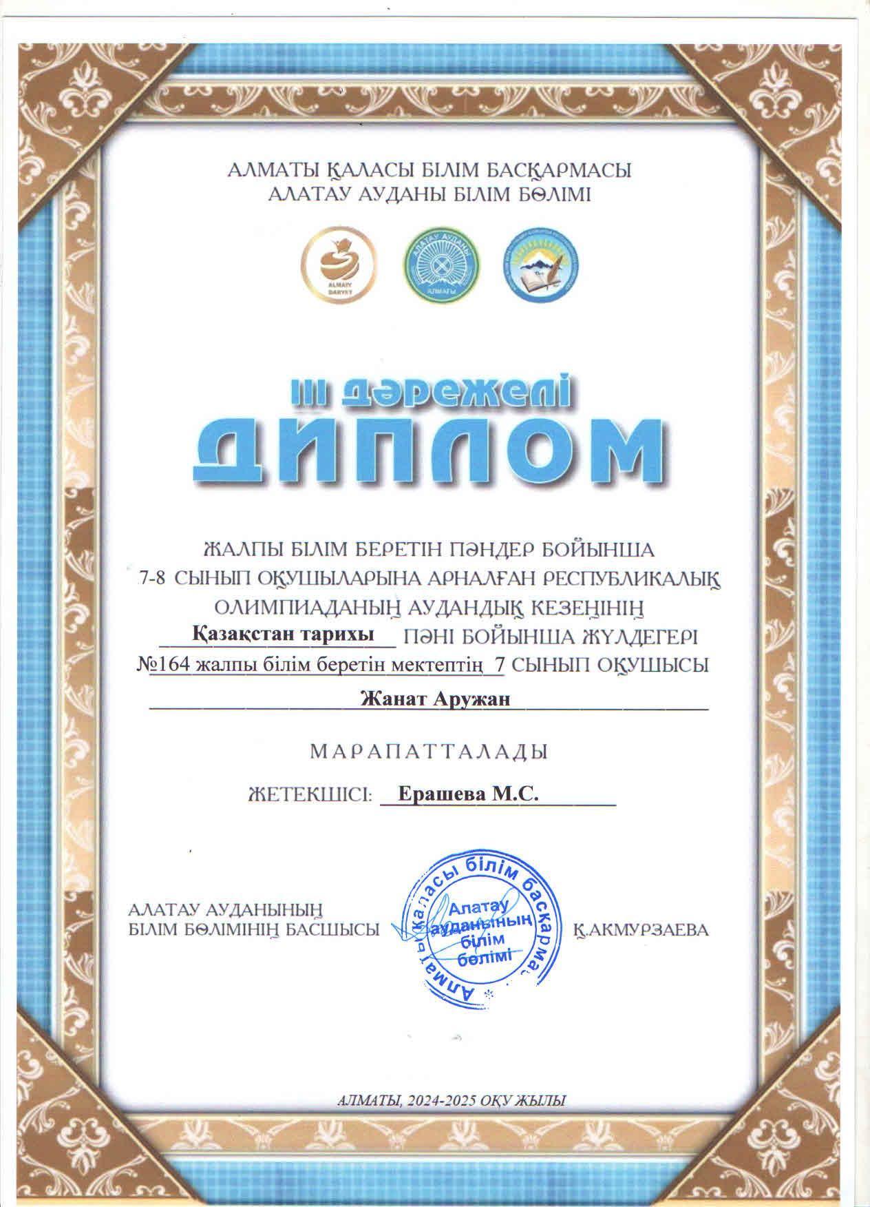 Жалпы білім беретін пәндер бойынша 7-8 сынып оқушыларына арналған республикалық жасөспірімдер олимпиадасының аудандық кезеңіне ҚАЗАҚСТАН ТАРИХЫ пәні бойынша қатысып, жүлделі ІІІ орынға ие болған 7 "В" сынып оқушысы Жанат Аружан.