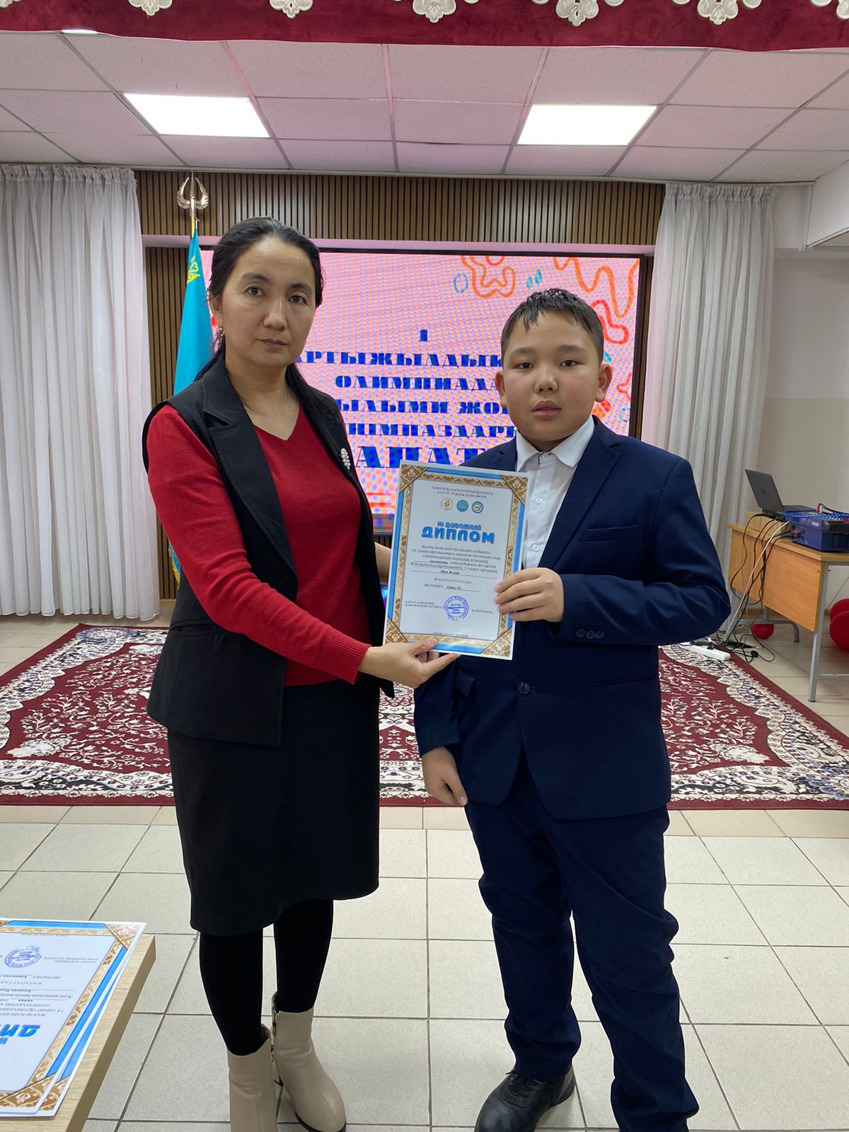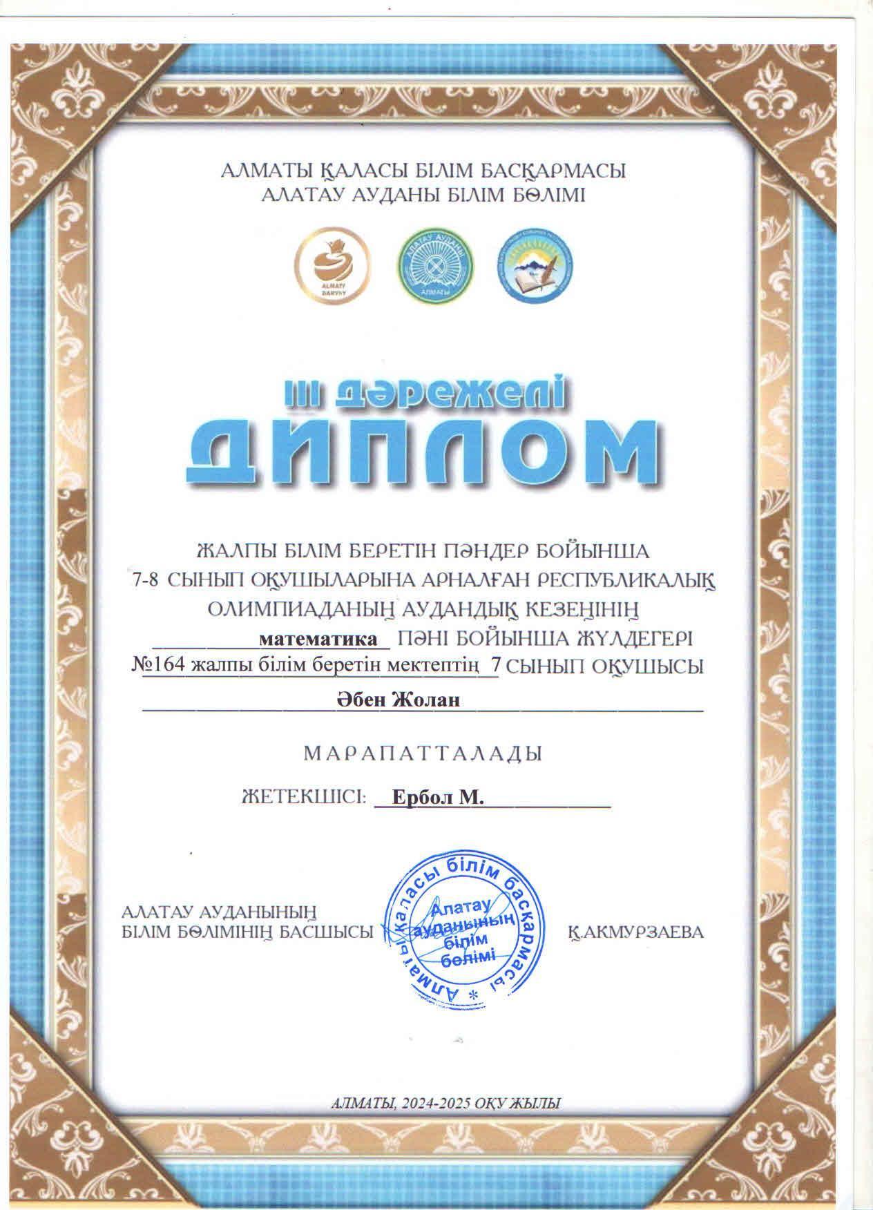Жалпы білім беретін пәндер бойынша 7-8 сынып оқушыларына арналған республикалық жасөспірімдер олимпиадасының аудандық кезеңіне МАТЕМАТИКА пәні бойынша қатысып, жүлделі ІІІ орынға ие болған 7 "Б" сынып оқушысы Әбен Жолан.