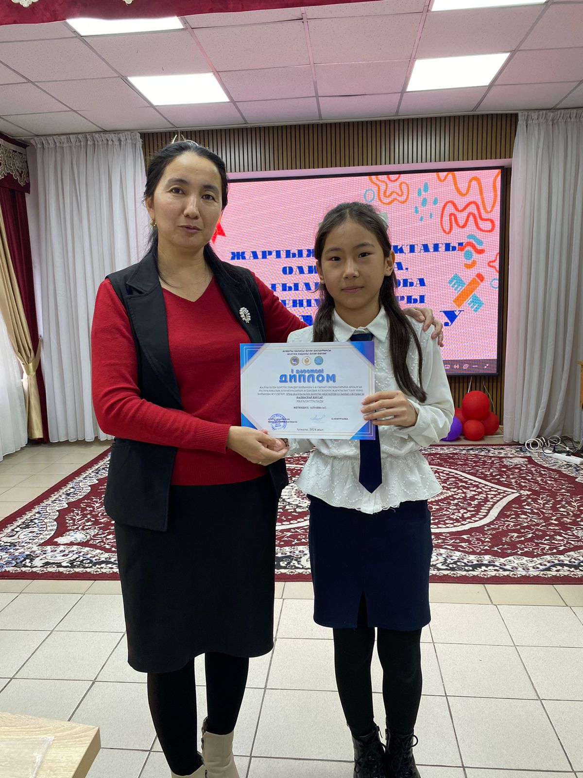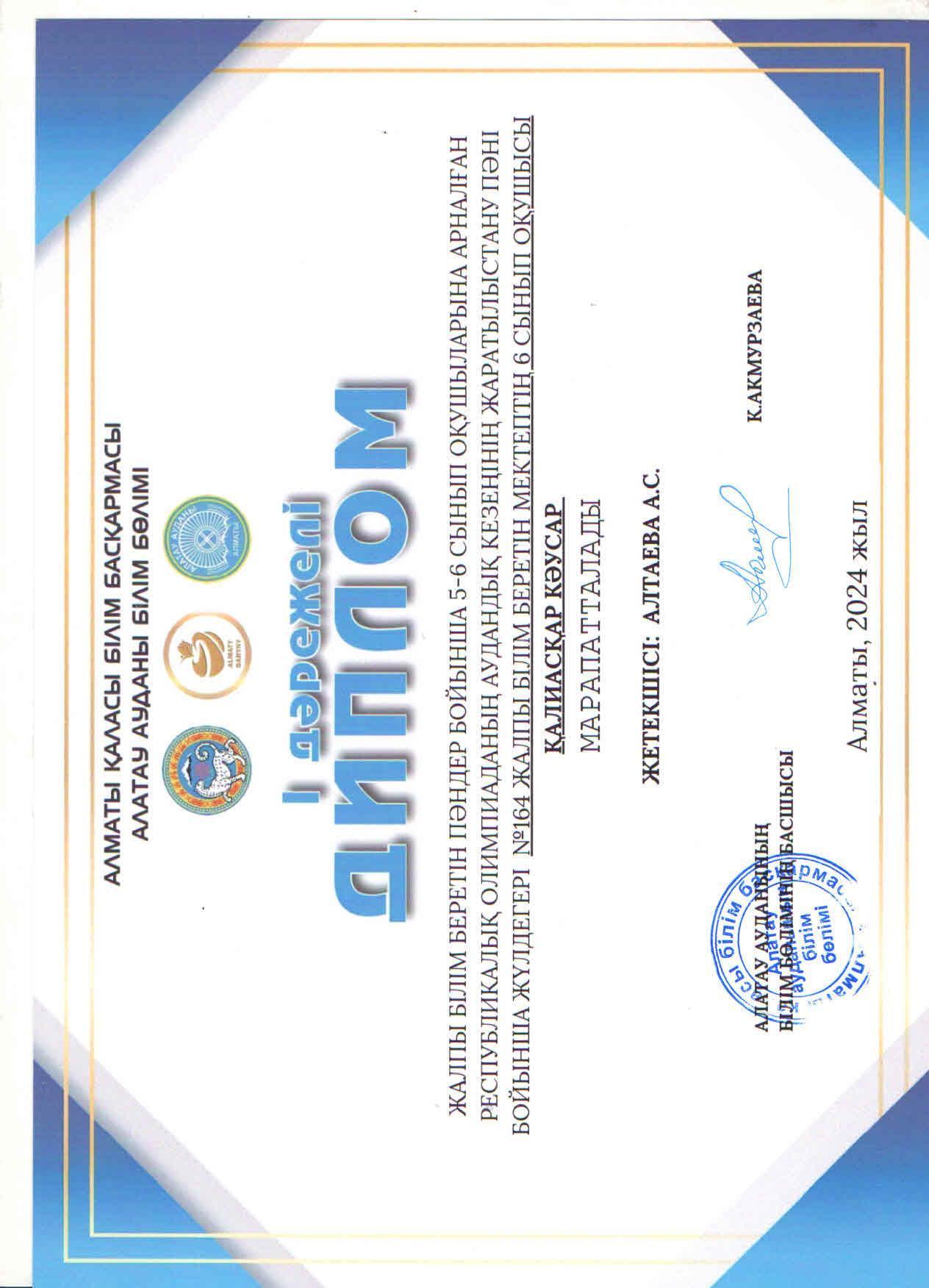 Жалпы білім беретін пәндер бойынша 5-6 сынып оқушыларына арналған республикалық олимпиаданың аудандық кезеңіне ЖАРАТЫЛЫСТАНУ пәні бойынша қатысып, жүлделі І орынға ие болған 6 "А" сынып оқушысы Қалиасқар Кәусар.