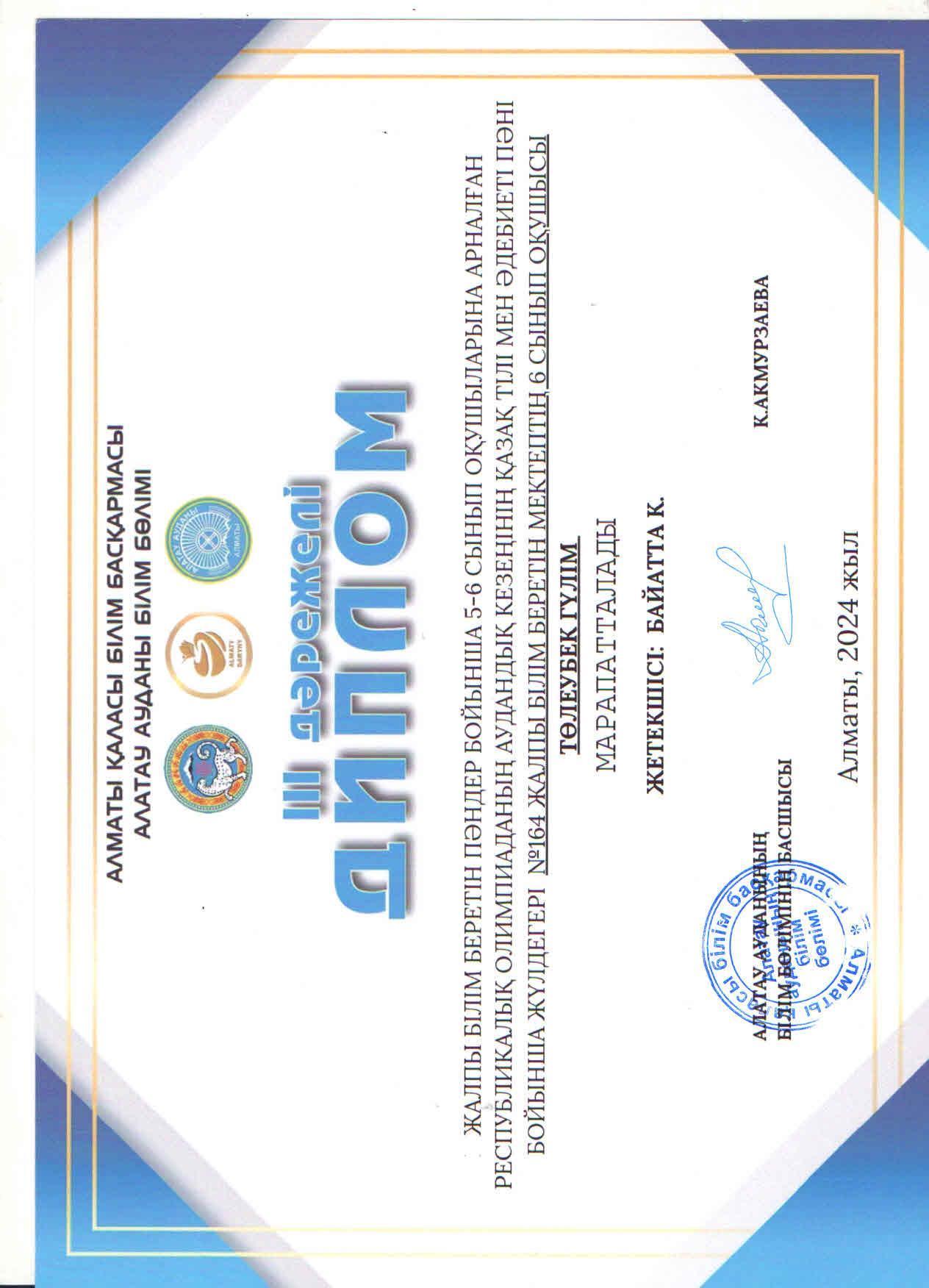 №164 Жалпы білім беретін мектеп » Ақпарат » Жалпы білім беретін пәндер бойынша 5-6 сынып оқушыларына арналған республикалық олимпиаданың аудандық кезеңіне ҚАЗАҚ ТІЛІ пәні бойынша қатысып, жүлделі ІІІ орынға ие болған 6 "А" сынып оқушысы Төлеубек Гүлім.