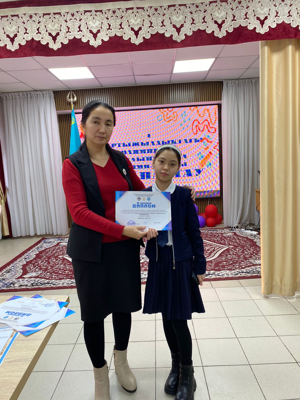 Жалпы білім беретін пәндер бойынша 5-6 сынып оқушыларына арналған республикалық олимпиаданың аудандық кезеңіне ҚАЗАҚ ТІЛІ пәні бойынша қатысып, жүлделі ІІІ орынға ие болған 6 "А" сынып оқушысы Төлеубек Гүлім.