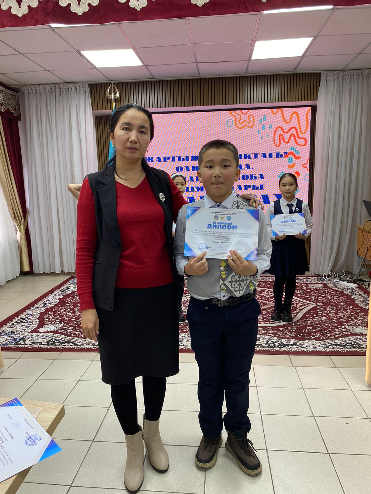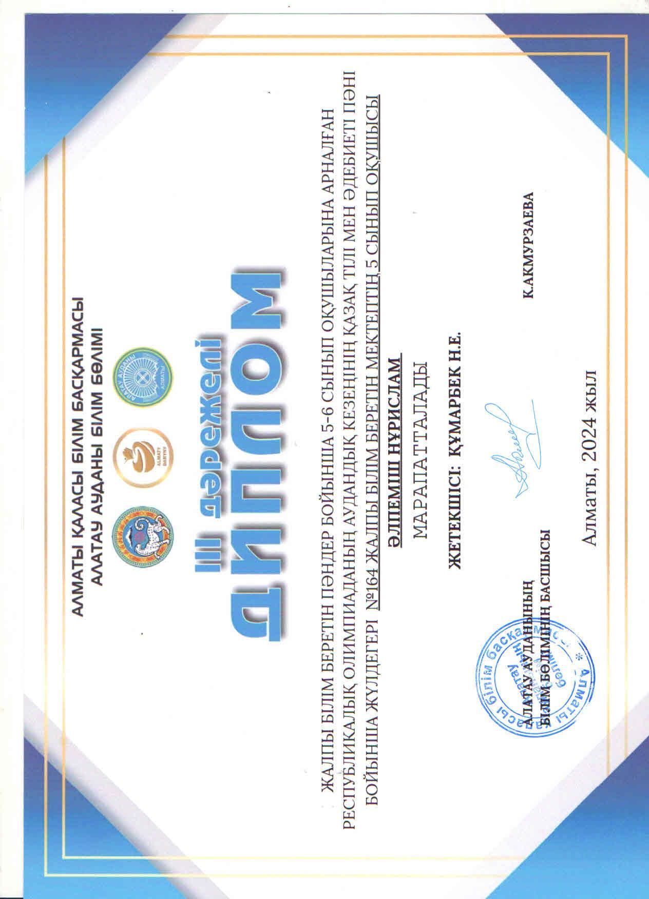Жалпы білім беретін пәндер бойынша 5-6 сынып оқушыларына арналған республикалық олимпиаданың аудандық кезеңіне ҚАЗАҚ ТІЛІ МЕН ӘДЕБИЕТІ пәні бойынша қатысып, жүлделі ІІІ орынға ие болған 5 "Б" сынып оқушысы Әлпеміш Нұрислам.