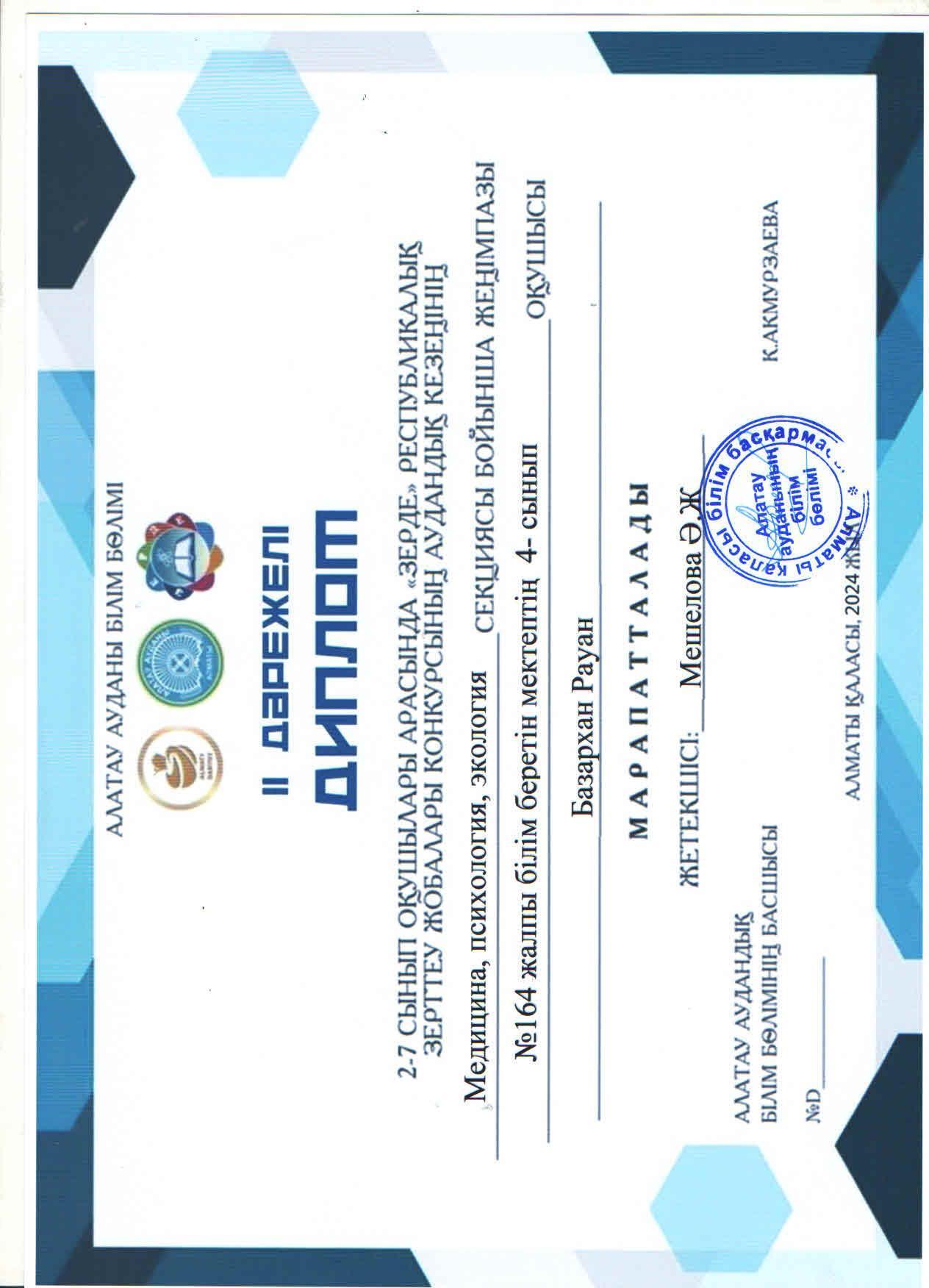 №164 Жалпы білім беретін мектеп » Ақпарат » 2-7 сынып оқушыларының зерттеу жұмыстары мен шығармашылық жобаларының "ЗЕРДЕ" республикалық конкурсының аудандық кезеңінің "Медицина, психология, экология" секциясы бойынша жүлделі ІІ орын иегерлері 4 сынып оқушылары Е.Алмазұлы, Р.Базархан.