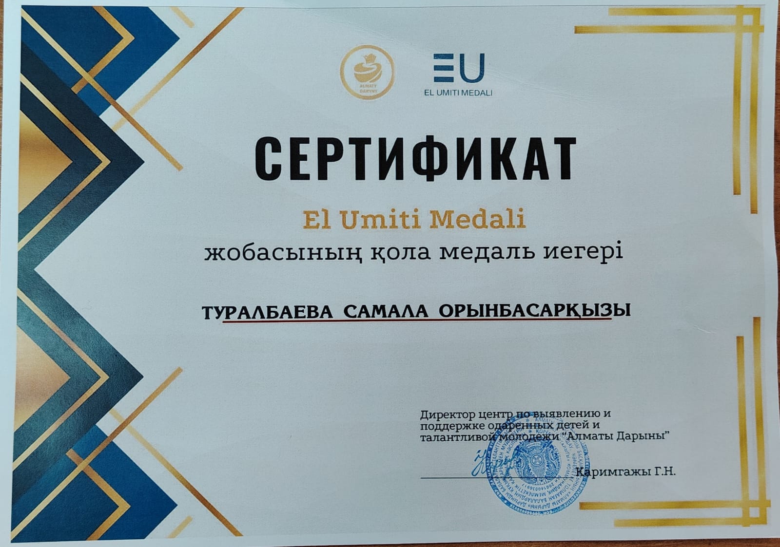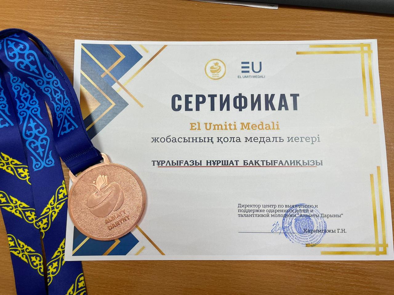 "Алматы дарыны" дарынды балалар мен талантты жастарды анықтау және қолдау жөніндегі орталығы ұйымдастырған "Ел үміті медалі" жобасына бастауыш сынып мұғалімі С.Туралбаева мен ағылшын тілі пәні мұғалімі Н.Тұрлығазы қатысып, қола медаль иеленді.