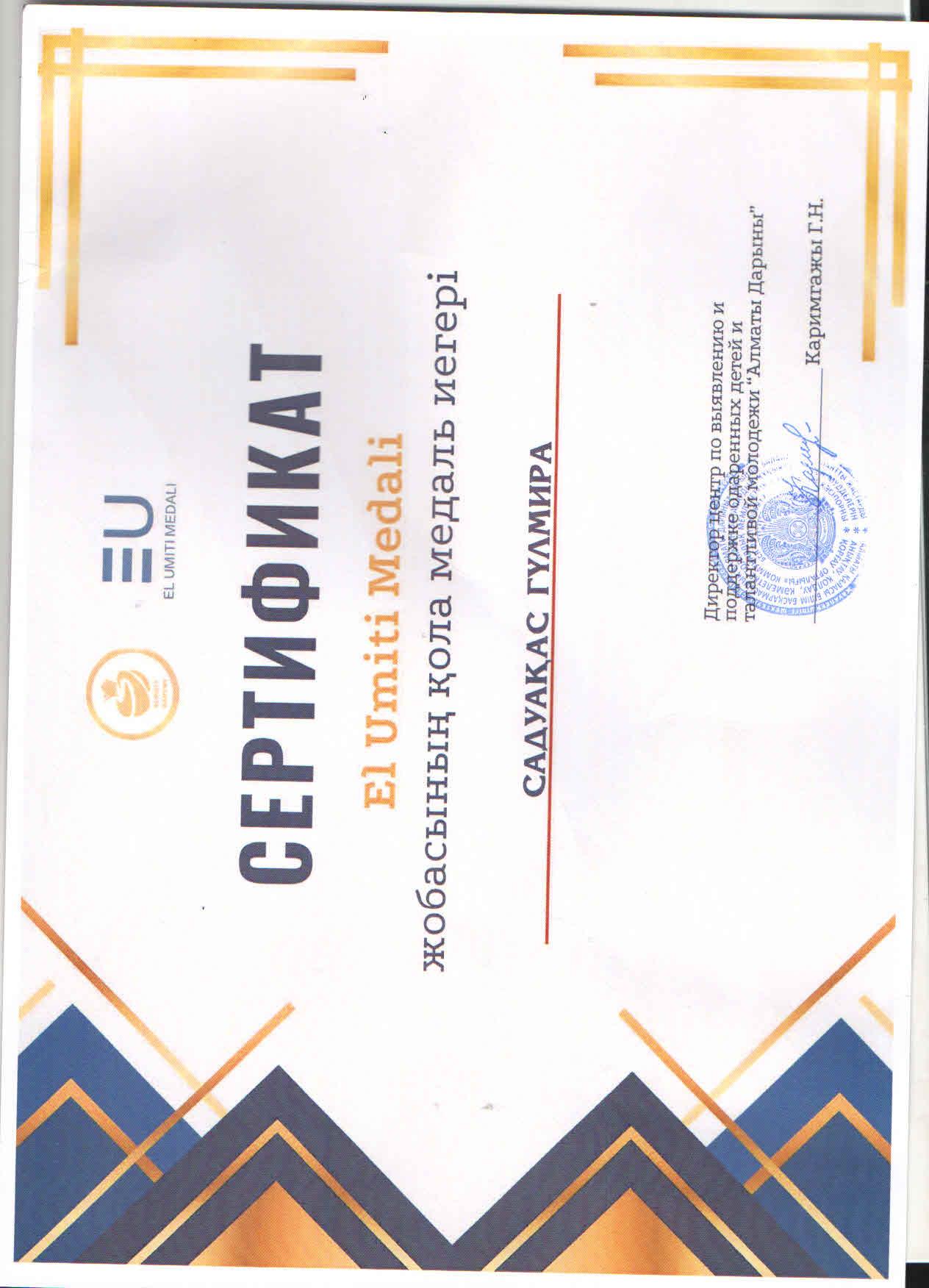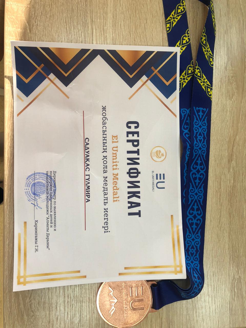 Алматы қаласы Білім басқармасының "Алматы дарыны" дарынды балалар мен талантты жастарды анықтау және қолдау жөніндегі орталығы ұйымдастырған "Ел үміті медалі" жобасына 10 "Б" сынып оқушысы Садуакас Гүлмира қатысып, қола медаль иеленді.