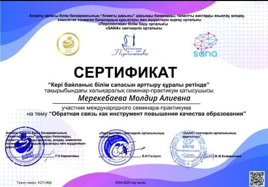 Алматы қаласы Білім басқармасының "Алматы дарыны" дарынды балалар мен талантты жастарды анықтау және қолдау жөніндегі орталығы "Перспектива" білім беру орталығы және "SANA" зияткерлік орталығы ұйымдастырған "Кері байланыс білім сапасын арттыру құралы ретінде" тақырыбындағы халықаралық семинар-практикумге бастауыш сынып мұғалімдері З.Куатбекова мен М.Мерекебаева қатысып, сертификат алды.