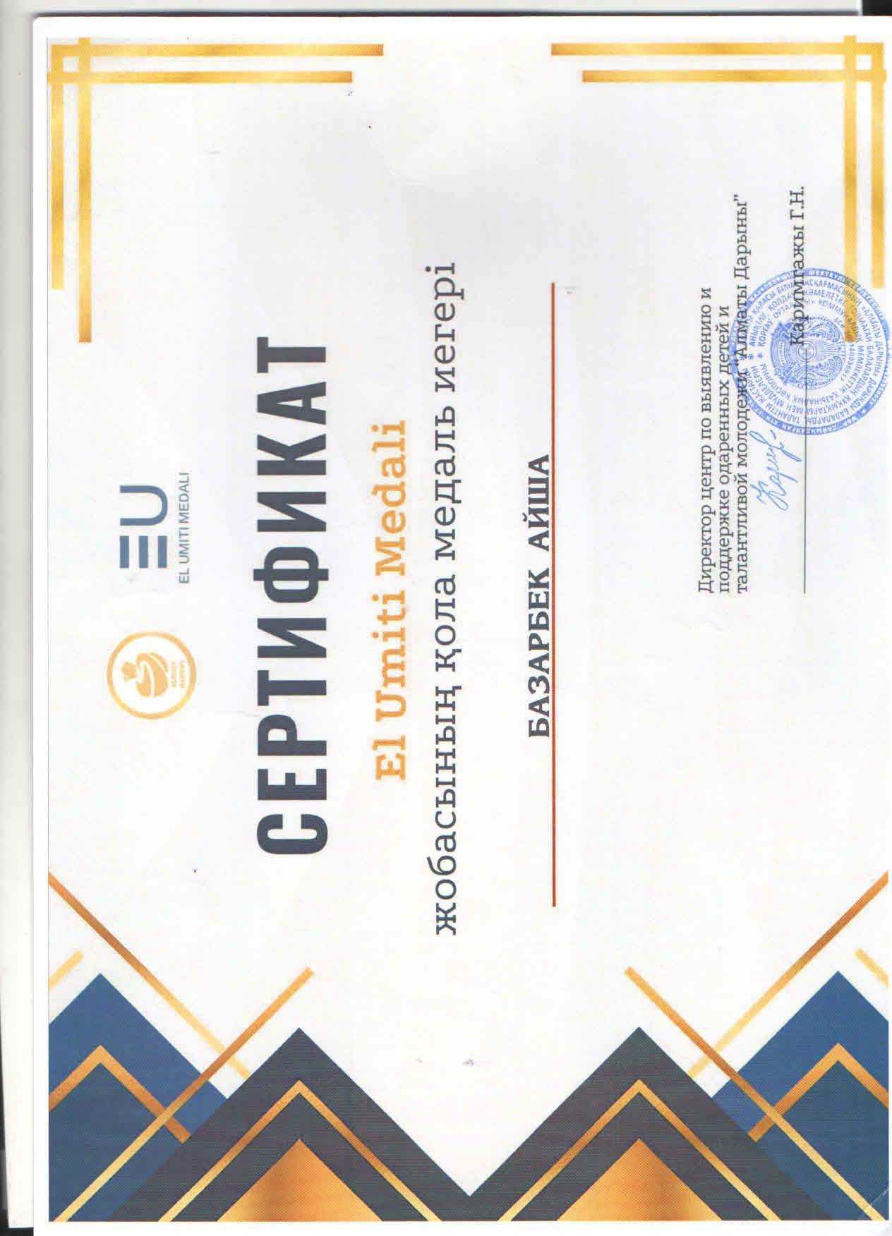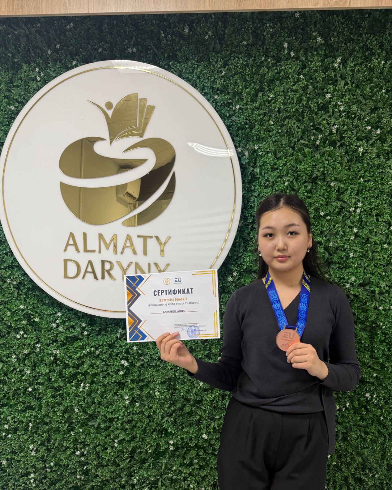 Алматы қаласы Білім басқармасының "Алматы дарыны" дарынды балалар мен талантты жастарды анықтау және қолдау жөніндегі орталығы ұйымдастырған "Ел үміті медалі" жобасына 10 "Ә" сынып оқушысы А.Базарбек қатысып, қола медаль иеленді