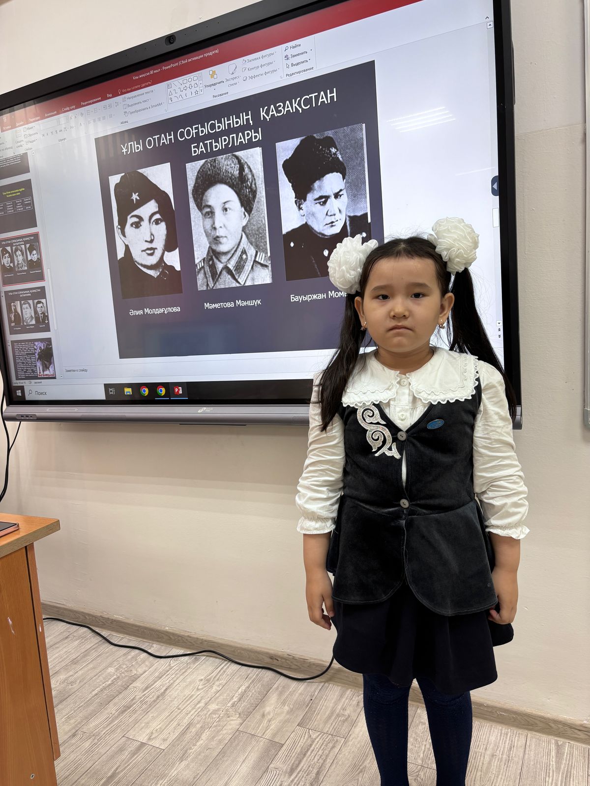 Ұлы Жеңістің 80 жылдығына орай кітапханашы Г.Какенова "Ұлы Жеңіске 80 жыл" атты кітап көрмесін ұйымдастырды. Мақсаты: ұлтымыздың болашағы үшін қан мен тер төккен батыр бабаларымызды ұмытпау, олардың аманатын өскелең ұрпаққа жеткізу. Сонымен бірге 1"А" сынып оқушылары Жеңіс туралы өлеңдерін жатқа мәнерлеп оқып, кітапханада көрмемен танысты. 1 "А" сынып жетекшісі Т.Қуанышбаева.