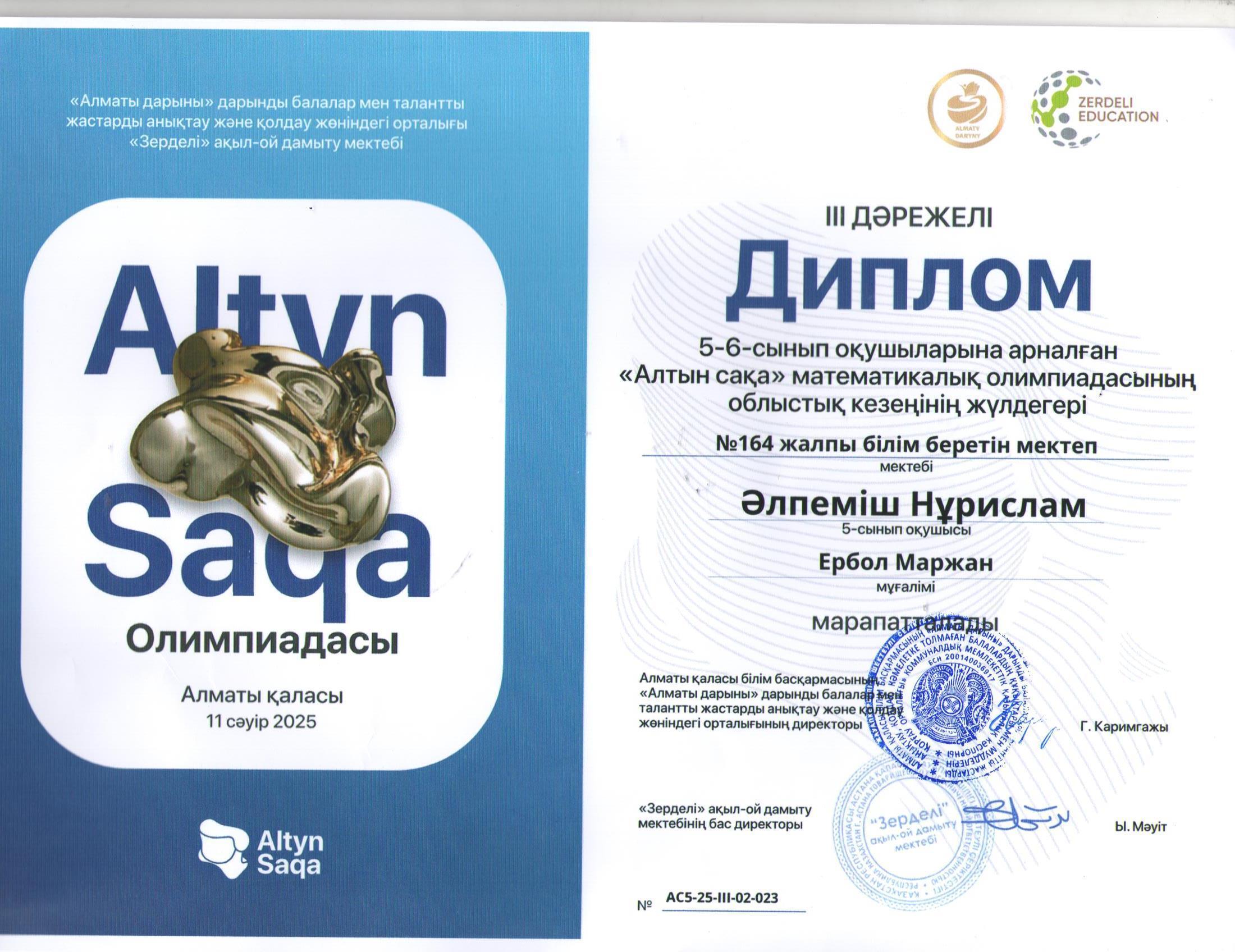 "Алматы дарыны" дарынды балалар мен талантты жастарды анықтау және қолдау жөніндегі орталығы және "Зерделі" ақыл-ой дамыту мектебі ұйымдастырған 5-6 сынып оқушыларына арналған "Алтын сақа"математикалық олимпиадасының қалалық кезеңінің ІІІ орын иегері 5"Б"сынып оқушысы Әлпеміш Нұрислам. Жетекшісі математика пәні мұғалімі М.Ербол.