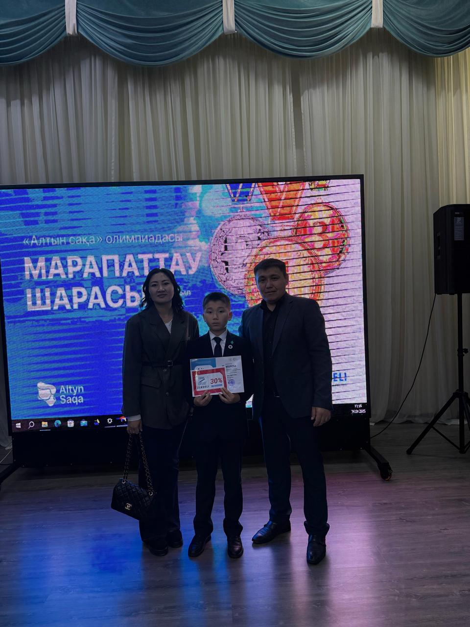 "Зерделі" ақыл-ой дамыту мектебі ұйымдастырған 5-6 сынып оқушыларына арналған "Алтын сақа"математикалық олимпиадасының қалалық кезеңінің ІІІ орын иегері 5"Б"сынып оқушысы Әлпеміш Нұрислам. Жетекшісі математика пәні мұғалімі М.Ербол.