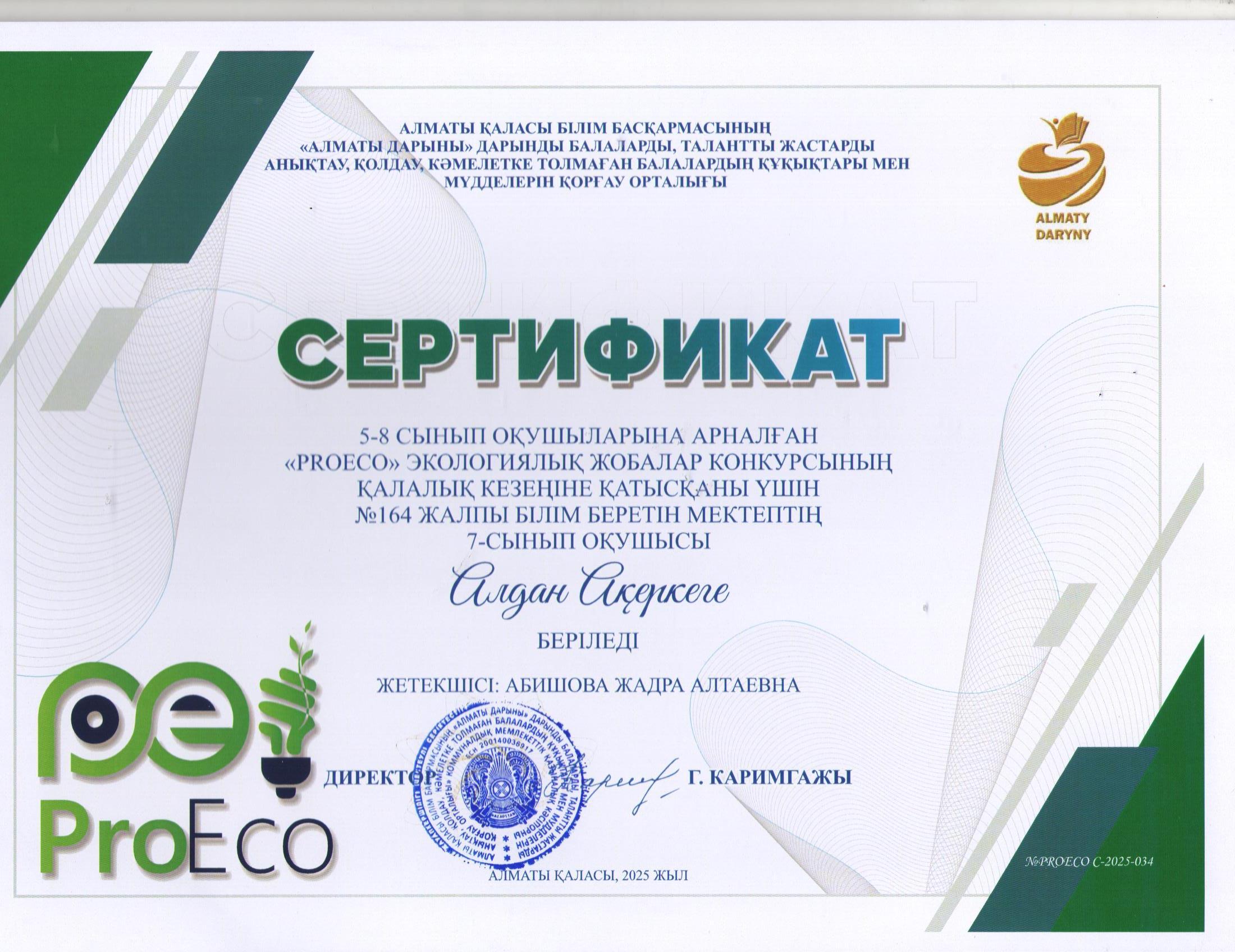 Алматы қаласы білім басқармасының "Алматы дарыны" дарынды балалар мен талантты жастарды анықтау және қолдау жөніндегі орталығы өткізген 5-8 сынып оқушыларына арналған "PROECO" экологиялық жобалар конкурсының қалалық кезеңінде "Таза қала сізден басталады" бағыты бойынша 7 "Б" сынып оқушысы Алдан Ақерке қатысып, жүлделі ІІ орынға ие болды. Жетекшісі биология пәні мұғалімі Ж.Абишова