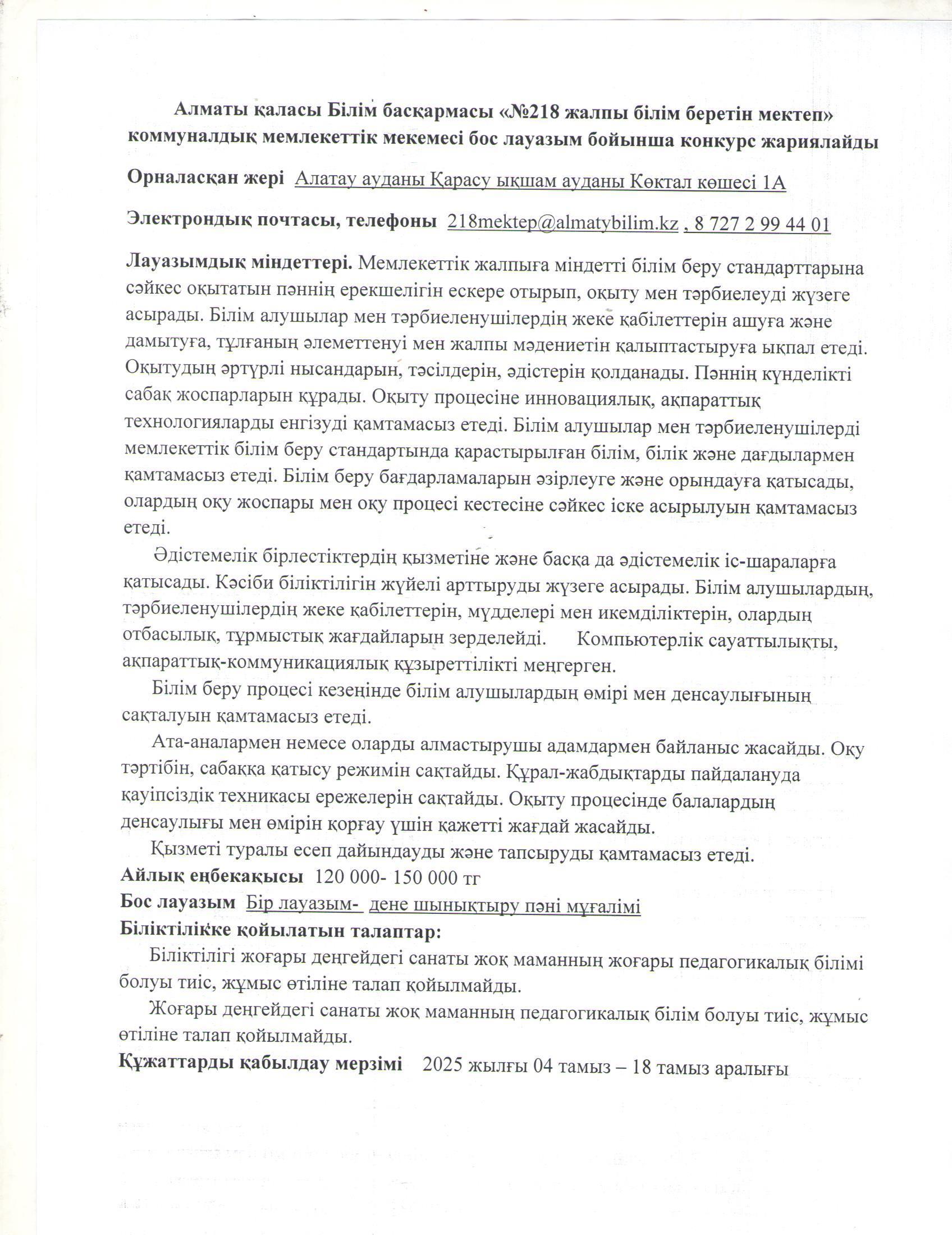 04 тамыз 2025 0 1 2 3 4 5 Мемлекеттік білім беру ұйымдарының педагогтерін бос лауазымға жариялаған конкурсының хабарландыруы Осы беттің QR-коды:QR-код этой страницы: