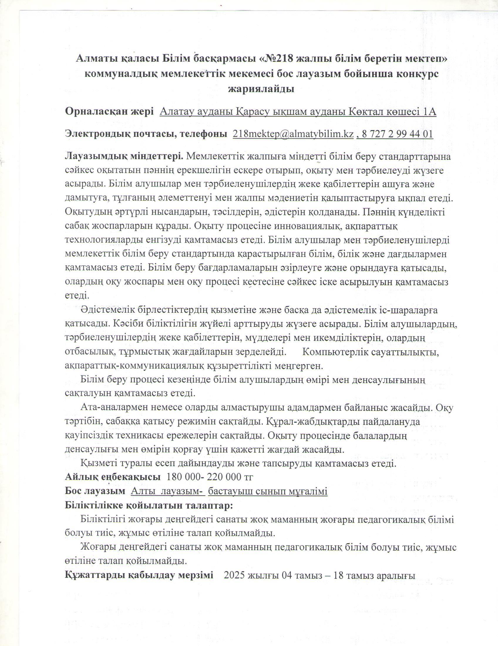04 тамыз 2025 0 1 2 3 4 5 "Мемлекеттік білім беру ұйымдарының педагогтерін бос лауазымға жариялаған конкурсының хабарландыруы". Бастауыш сынып мұғалімдері үшін Осы беттің QR-коды:QR-код этой страницы: