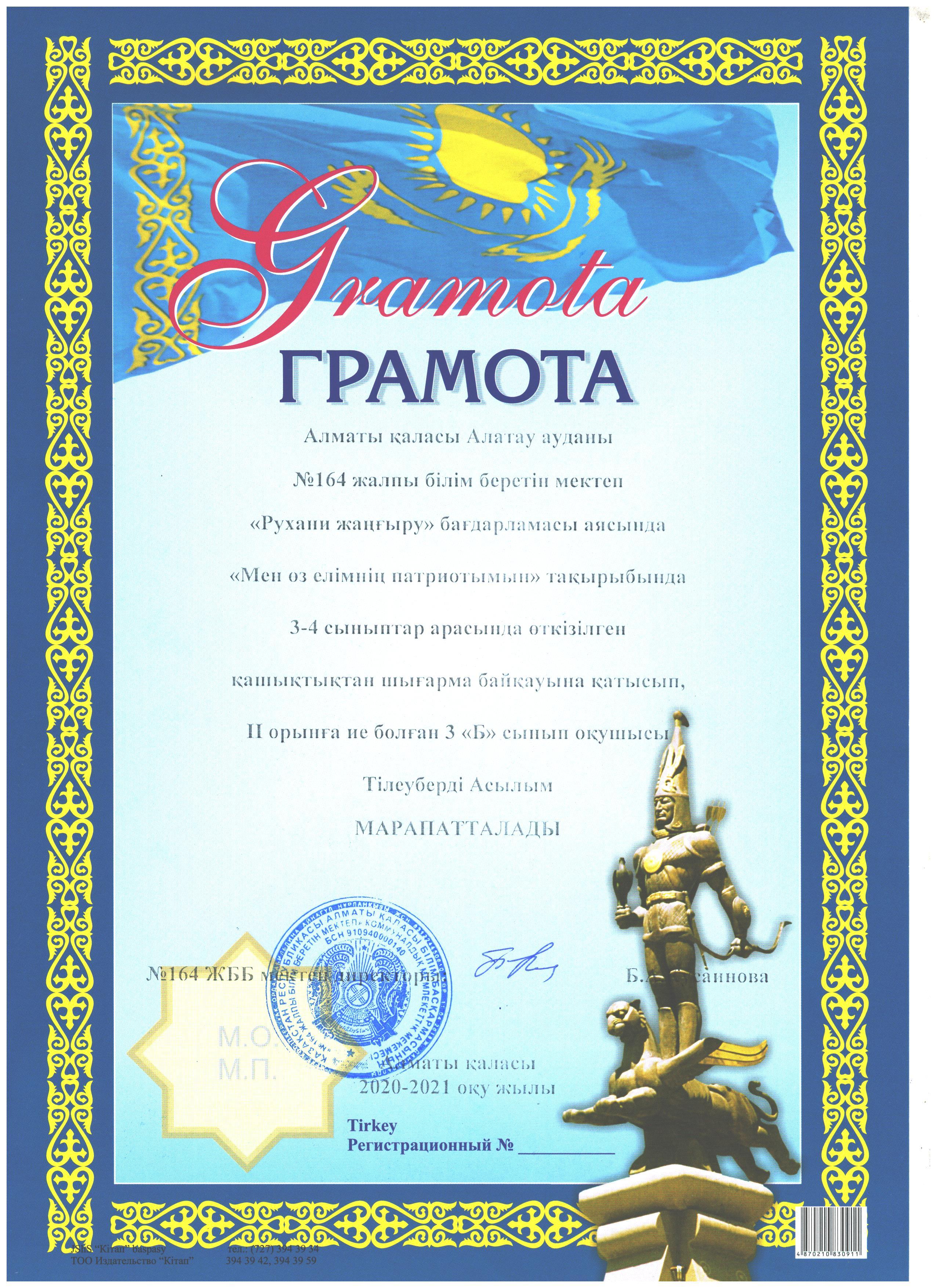 №164 Жалпы білім беретін мектеп » Ақпарат » Мектебімізде "Рухани жаңғыру" бағдарламасы аясында "Мен өз елімнің патриотымын" тақырыбында 3-4 сыныптар арасында қашықтықтан мектешішілік шығарма байқауы өткізілді. Байқаудан 4 "В" сынып оқушысы Арғынбек Айша І орынға ие болды.