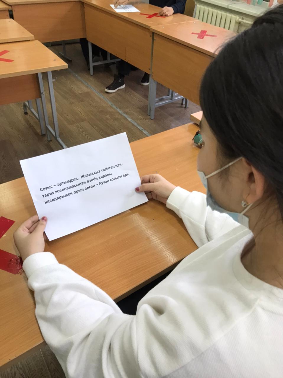 Мектебіміздің 9 сынып оқушыларымен «Бейбітшілік үшін күрескен қаһармандарарамыз» тақырыбында дөңгелек үстел өткізілді. Оқушыларымыздың қызығушылығы өте жоғары болғандықтан, бір-бірімен пікір алмасып, сабақ жоғары деңгейде өтті.