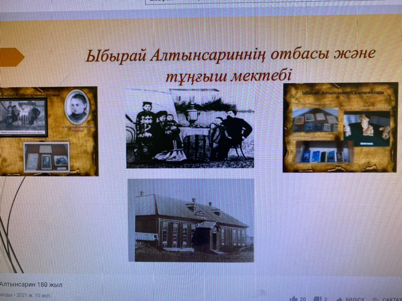 5-6 сынып оқушыларына "Мұражайлардағы жанды сабақтар" жоспарына сәйкес Ыбырай Алтынсариннің 180 жыл мерейтойына орай мектебіміздің директордың тәрбие ісі жөніндегі орынбасарлары Ыбырай Алтынсарин туралы слайд көрсетіп, мұражайымен таныстырды.