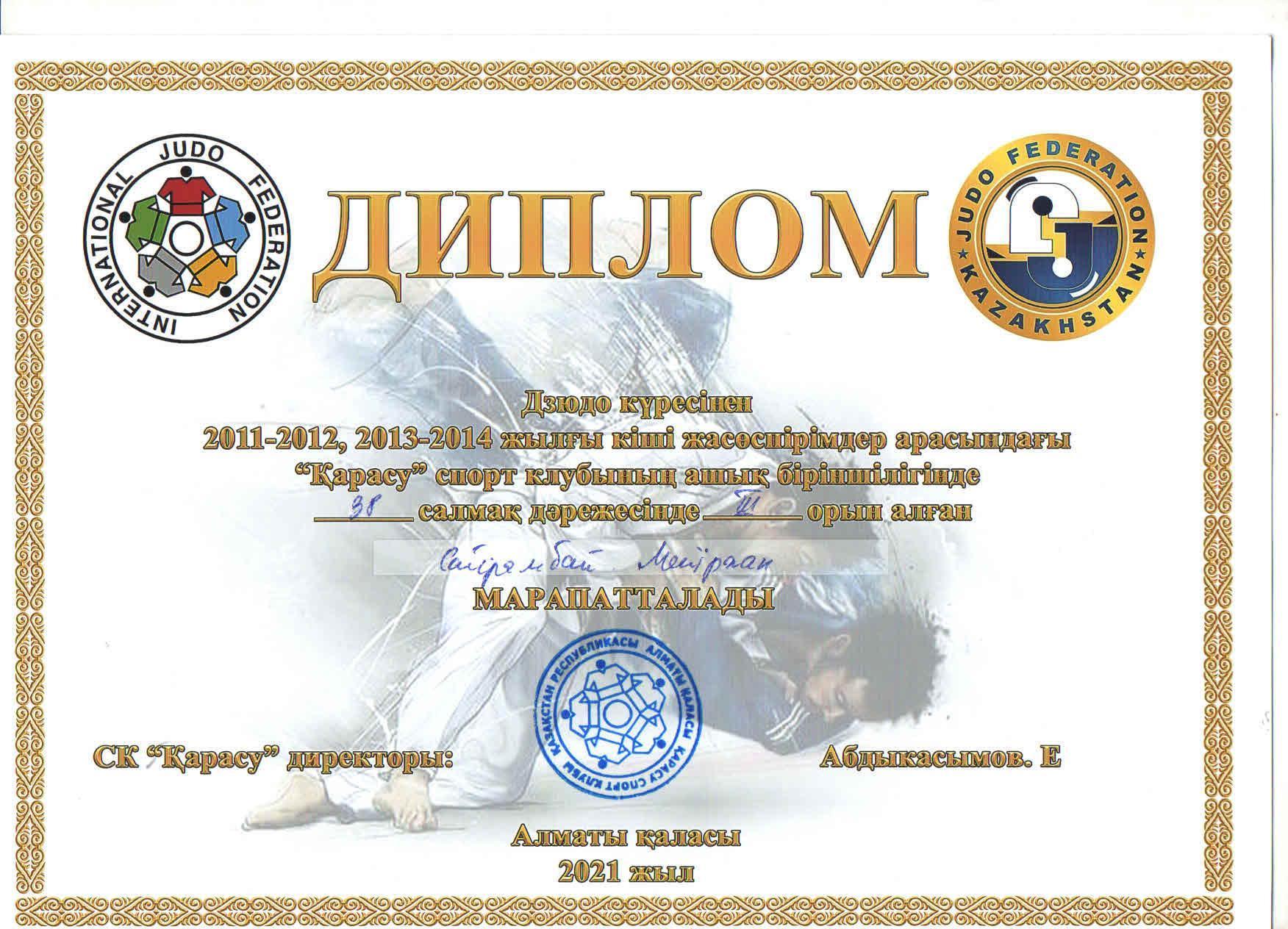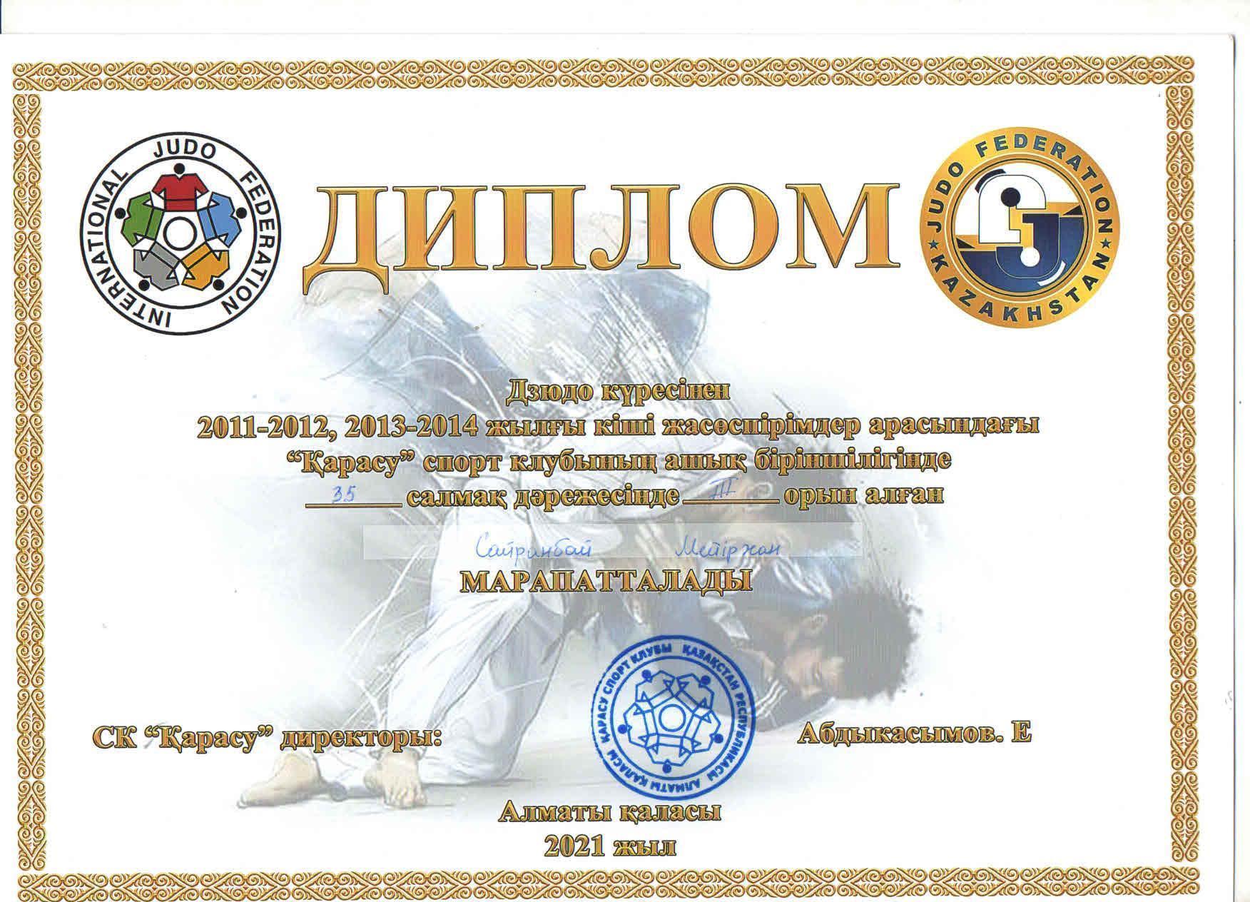 Дзюдо күресінен кіші жасөспірімдер арасындағы "Қарасу" спорт клубының біріншілігінде 35 және 38 кг салмақ дәрежесінде жүлделі ІІІ орынға ие болған 5 "Б" сынып оқушысы Сайрамбай Мейіржан.