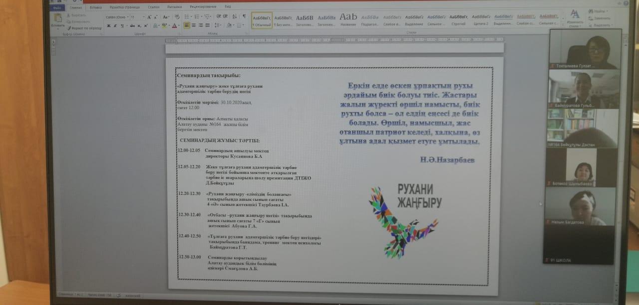 №164 Жалпы білім беретін мектеп » Біз туралы » Аудандық іс-шаралар жоспарына сәйкес 2020 жылдың 30 қазан күні мектебіміздің әкімшілігінің ұйымдастыруымен «Рухани жаңғыру» жеке тұлғаға рухани адамгершілік тәрбие берудің негізі атты семинары өткізілді.
