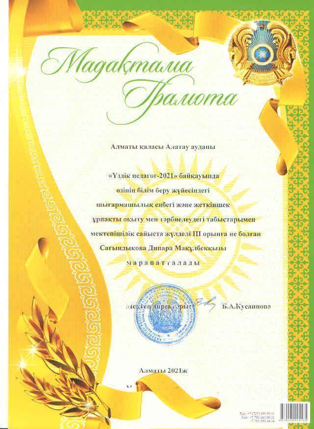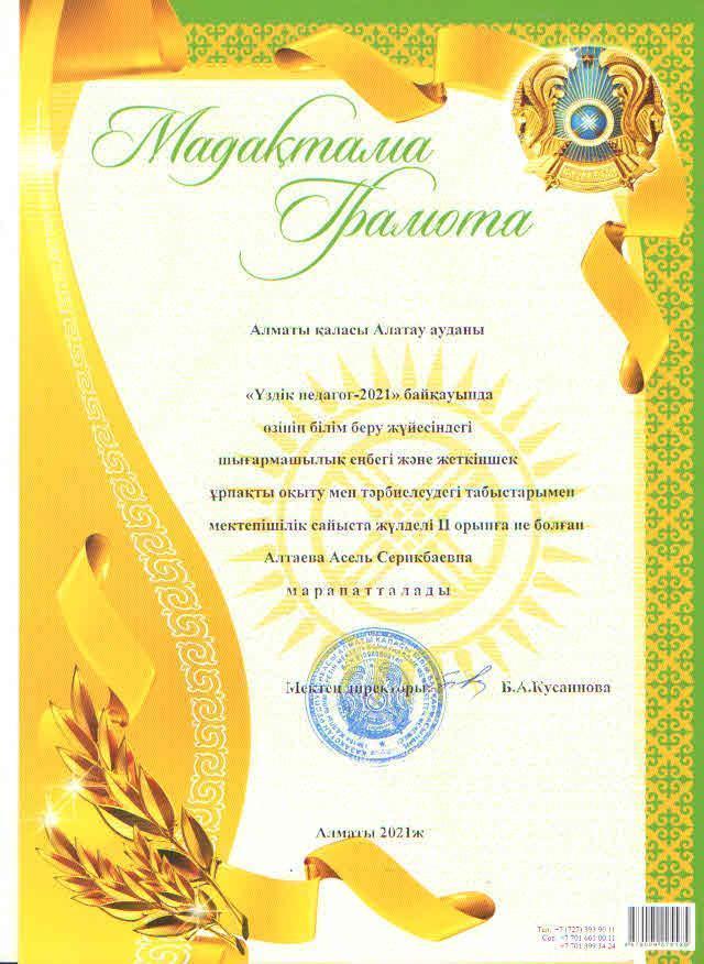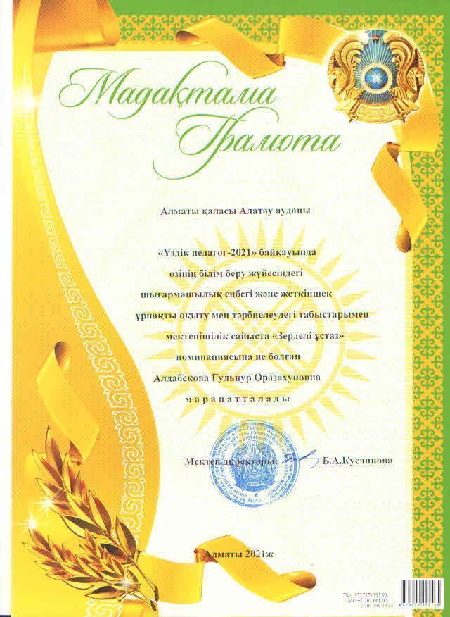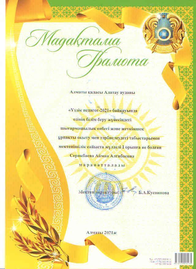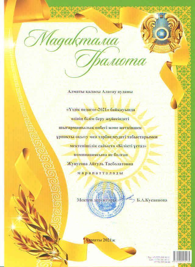 Мектепішілік "Үздік педагог -2021"байқауының қорытындысы жарысқа қатысушылардың алған ұпай сандарын есептей келе, Бас жүлдені бастауыш сынып мұғалімі Куатбекова Забира Жумановна, І орынды музыка пәні мұғалімі Серикбаева Айм