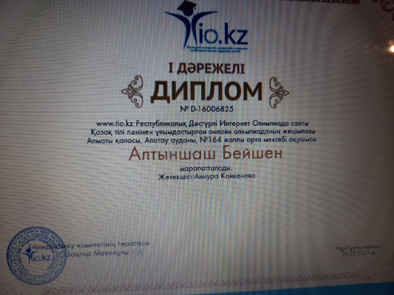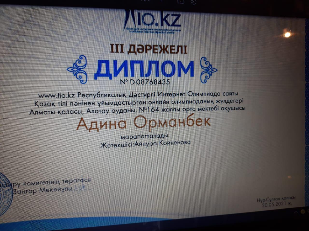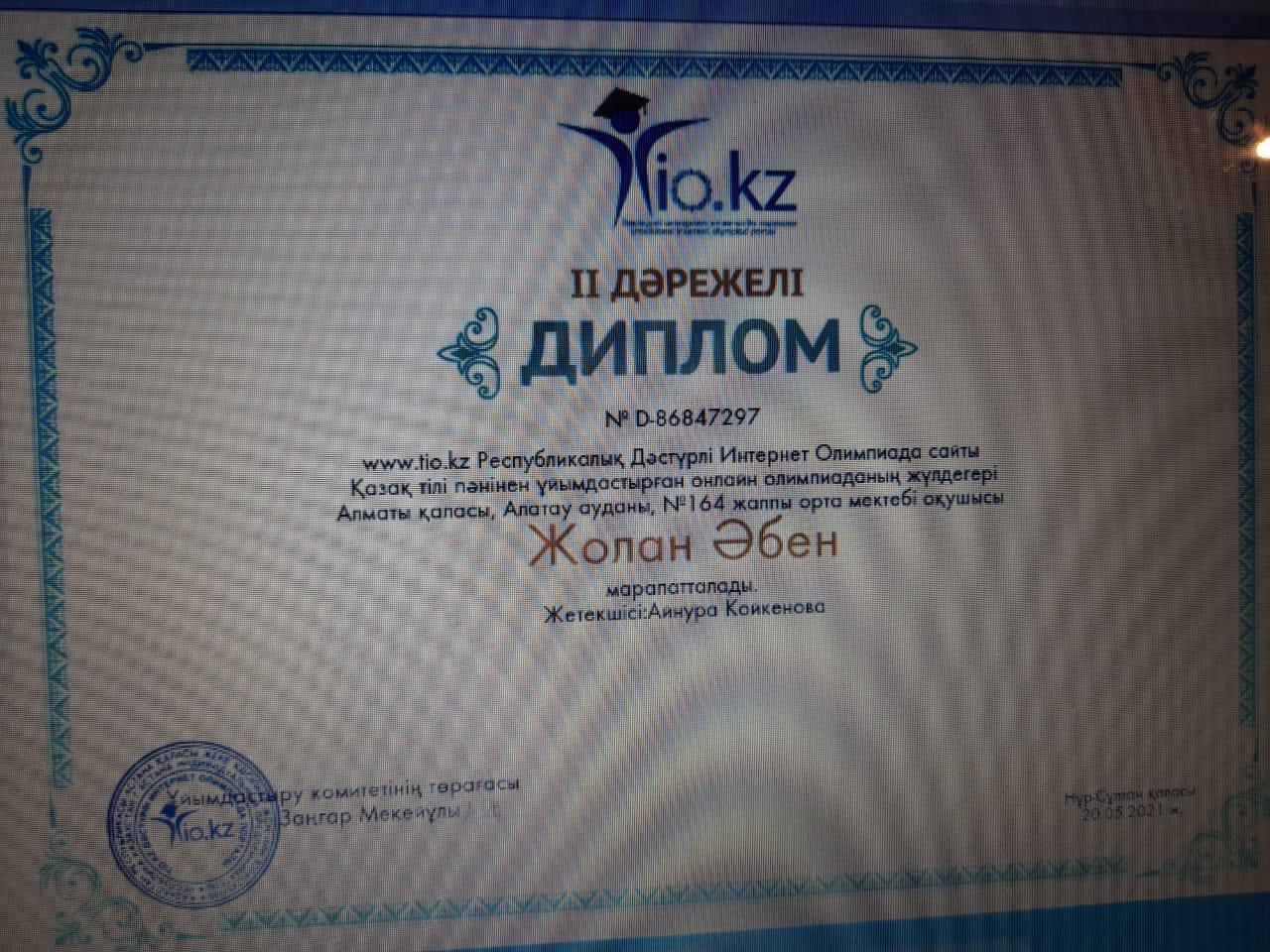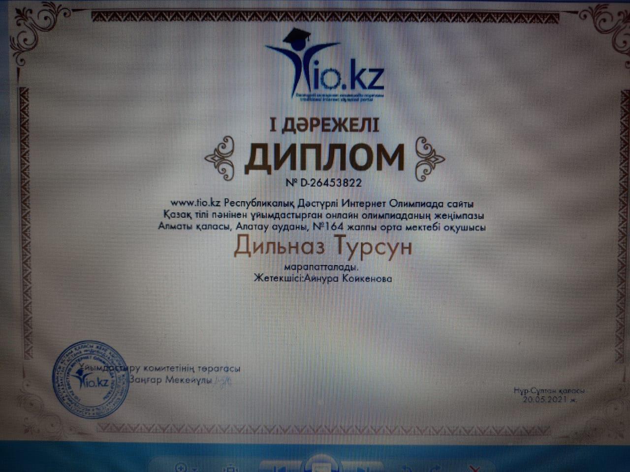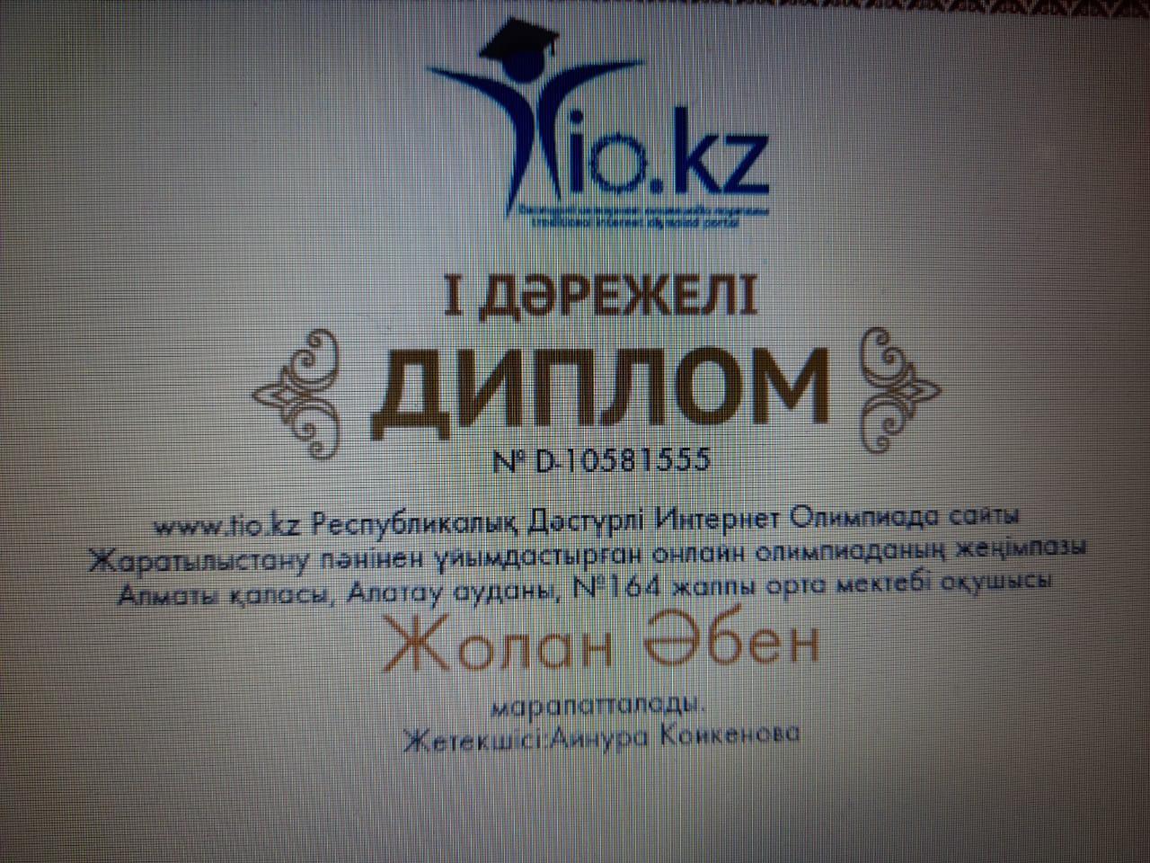 www.tio.kz Республикалық Дәстүрлі интернет олимпиада сайты ұйымдастырған пәндік олимпиадаға 3 "Б сынып оқушылары қатысып, жүлделі орындарға ие болды, жетекшісі бастауыш сынып мұғалімі А.Қойкенова Құрмет грамотасымен марапатталды