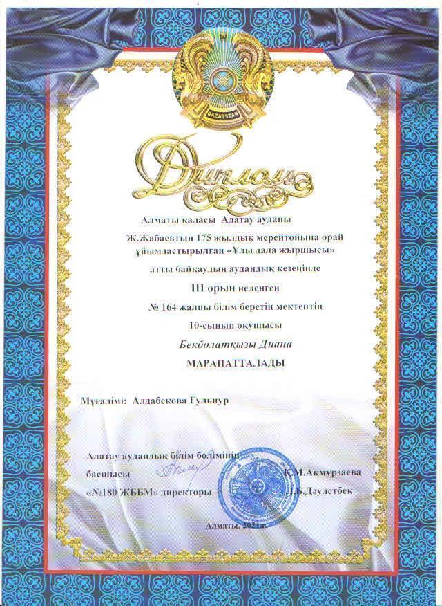 №164 Жалпы білім беретін мектеп » Біз туралы » Әдістемелік жұмыстар » Аудандық Жамбыл Жабаевтың 175 жылдық мерейтойына орай «Ұлы дала жыршысы» байқауының ІІ орын иегері 9 "Б" сынып оқушысы Кесперова Амина, ІІІ орын иегері 10"Ә" сынып оқушысы Бекболатқызы Диана, жетекшілері қазақ тілі мен әдебиеті пәні мұғалімі