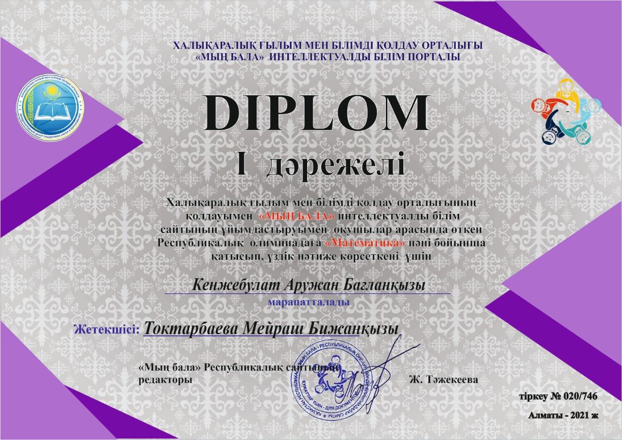 Халықаралық ғылым мен білімдіорталығының ұйымдастыруымен өткен "МЫҢ БАЛА" интеллектуалды білім сайтының оқушылар арасында өткен Республикалық математика пәні олимпиадасының І орын иегері 4 "А" сынып оқушысыКенжебулат Аружан мен Қариқызы