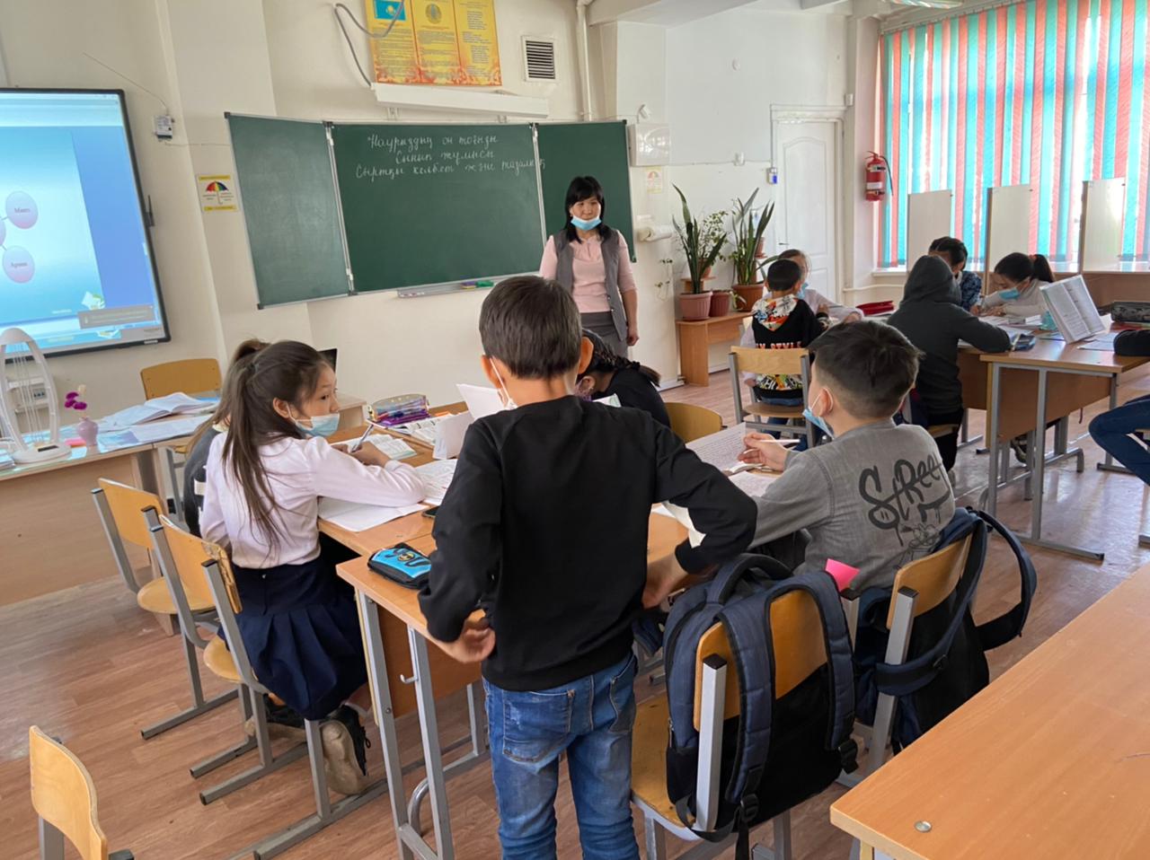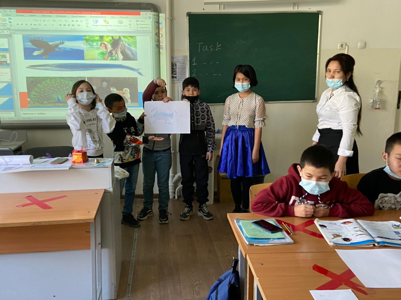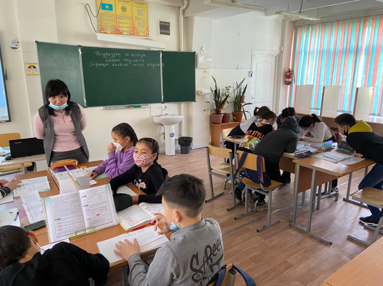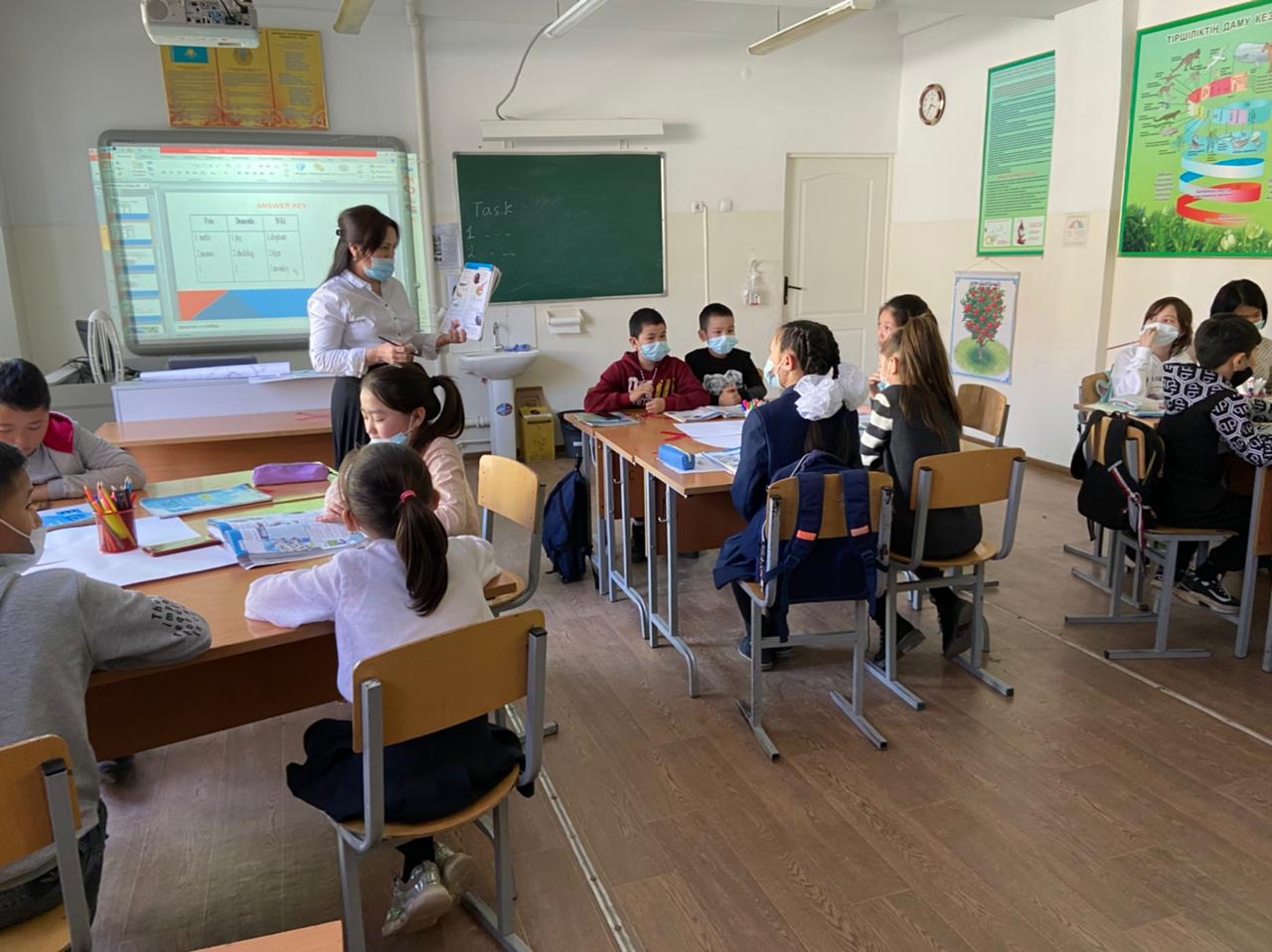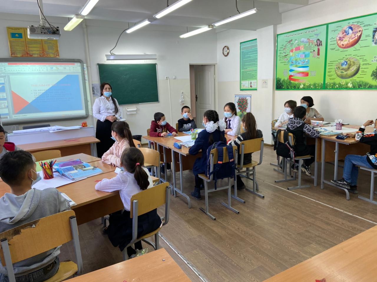 "Үздік педагог-2021" байқауының «Сабағым – мұғалімнің кәсіби тұжырымымның айнасы» туры бойынша ағылшын тілі пәні мұғалімі А.Т.Жунусова 5 "А" сыныбымен "Why we should love animals", қазақ тілі пәні мұғалімі Г.О.Алдабекова 5 "В"